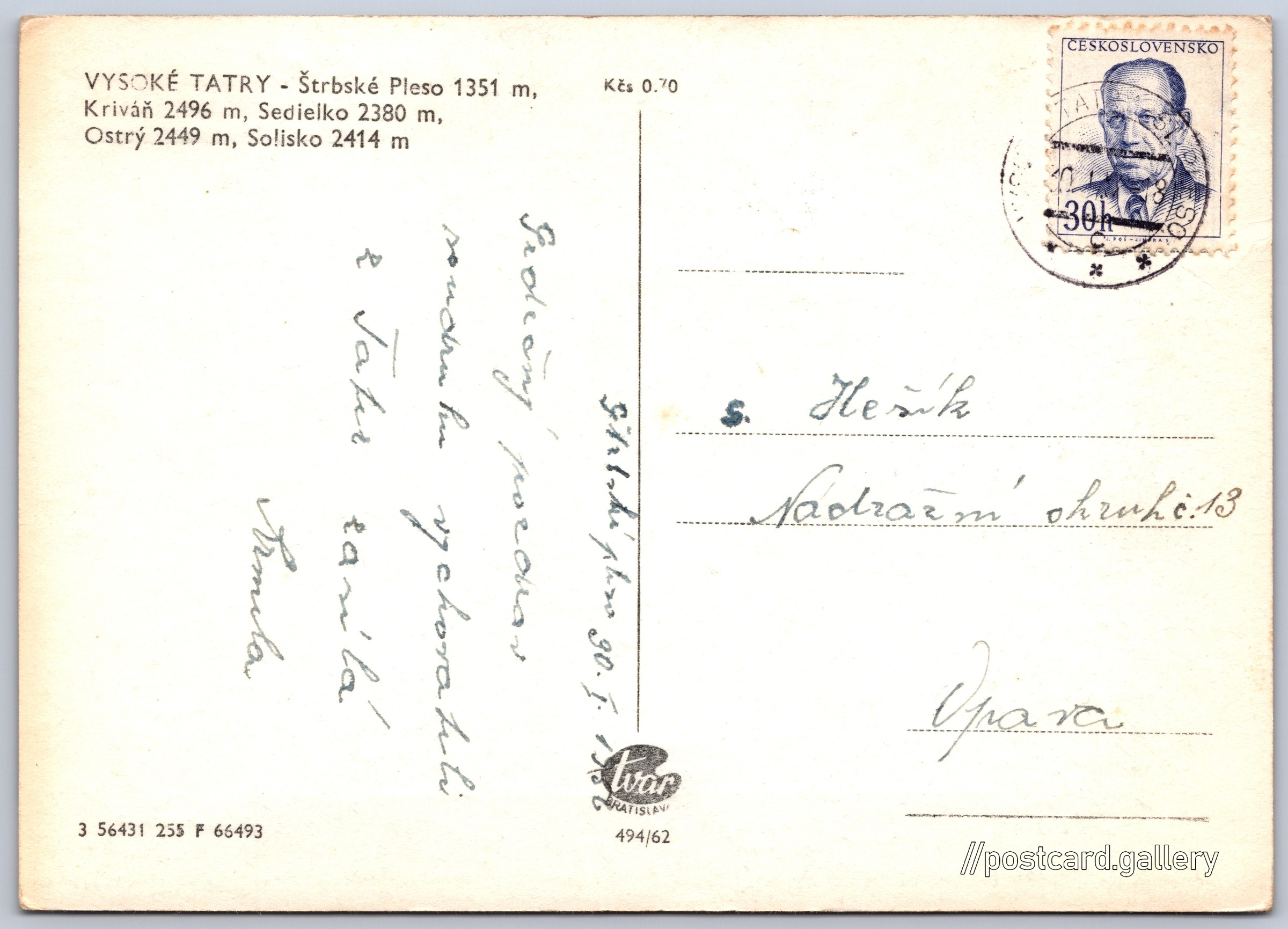 Vysoké Tatry, pohled ze Štrbského plesa Pokud chcete vidět pohlednice ve vyšším rozlišení nebo zobrazovat jejich zadní stranu, tak se prosím nejdříve přihlašte Přihlásit Zaregistrovat VYSOKÉ TATRY - Štrbské Pleso 1351 m, Kriváň 2496 m, Sedielko 2380 m, Ostrý 2449 m, Solisko 2414 m Jazyk tištěného textu na pohlednici: slovenština Kriváň (2494 m), Hora, výškový bod, Vysoké Tatry - Štrbské Pleso, Slovensko ukázat na mapě V blízkém okolí místa zobrazeného na pohlednici lze najít 224 jiných pohlednic. Zobrazit blízké pohlednice Vydavatel: Tvar Bratislava (Československo) Rok vydání pohlednice: únor, 1955 Velikost (š x v) a tvar pohlednice: 147 x 105 mm (5.79" x 4.13"), obdélník Prošlá poštou:Datum na razítku: 30.1.1956Datum napsání pohledu: 30.1.1956 Ceny: Cena pohlednice: 0,70 Kčs (CSK)Vyplacené známky: 0,30 Kčs (CSK) Kódy na pohlednici: 3 56431 255 F 66493 494/62 DiskuseVložit příspěvek Přidat novou složku ... Spravovat složky ...