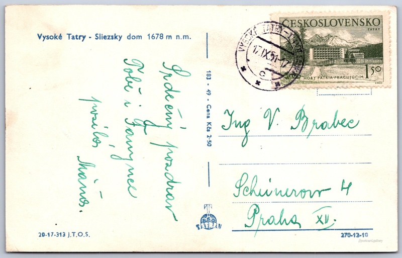 Vysoké Tatry, Slezský dům Pokud chcete vidět pohlednice ve vyšším rozlišení nebo zobrazovat jejich zadní stranu, tak se prosím nejdříve přihlašte Přihlásit Zaregistrovat Vysoké Tatry - Sliezsky dom 1678 m n.m. Jazyk tištěného textu na pohlednici: slovenština Sliezsky dom, Vysoké Tatry 32, Vysoké Tatry, Slovensko ukázat na mapě V blízkém okolí místa zobrazeného na pohlednici lze najít 108 jiných pohlednic. Zobrazit blízké pohlednice Vydavatel: Tatran (Československo) Odhadované datum vydání pohlednice: 1948 - 1951 Pomozte nám zpřesnit rok vzniku pohlednice Velikost (š x v) a tvar pohlednice: 138 x 87 mm (5.43" x 3.43"), obdélník Prošlá poštou:Datum na razítku: 17.9.1951 Ceny: Cena pohlednice: 2,50 Kčs (CSK)Vyplacené známky: 1,50 Kčs (CSK) Kódy na pohlednici: 183-49 20-17-313 J.T.O.S. 270-12-10 DiskuseVložit příspěvek Přidat novou složku ... Spravovat složky ...