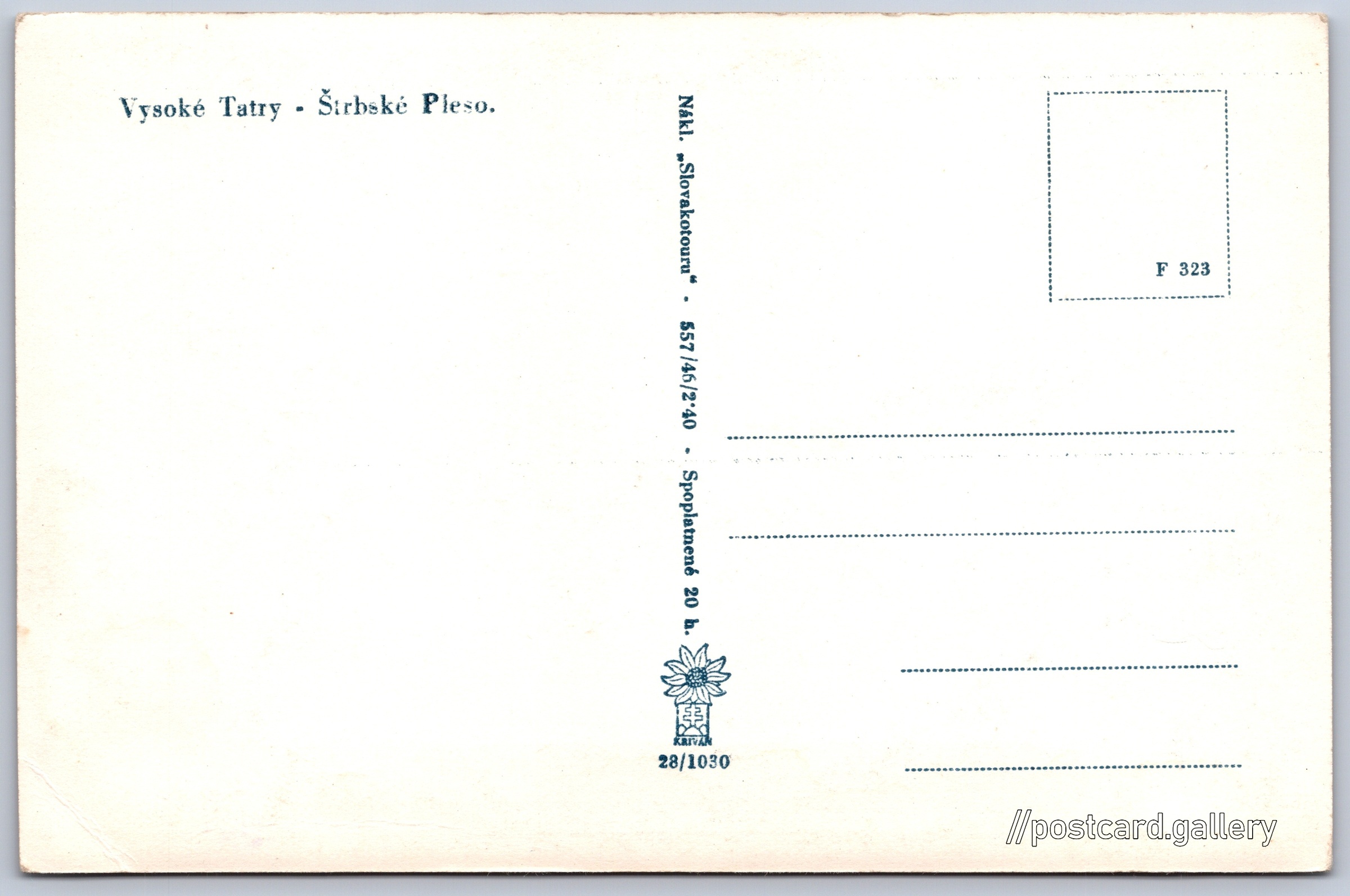 Vysoké Tatry, stanice železnice u Štrbského Plesa Pokud chcete vidět pohlednice ve vyšším rozlišení nebo zobrazovat jejich zadní stranu, tak se prosím nejdříve přihlašte Přihlásit Zaregistrovat Vysoké Tatry - Štrbské Pleso. Jazyk tištěného textu na pohlednici: slovenština Štrba - Štrbské pleso ukázat na mapě V blízkém okolí místa zobrazeného na pohlednici lze najít 79 jiných pohlednic. Zobrazit blízké pohlednice Vydavatel: Kriváň (Československo)Slovakotour (Československo) Datum vydání není známo Pomozte nám odhadnout datum vzniku pohlednice Velikost (š x v) a tvar pohlednice: 138 x 91 mm (5.43" x 3.58"), obdélník Čistá pohlednice (neprošlá poštou) Ceny: Příplatek na tur. ruch: 0,20 Kčs (CSK)) Kódy na pohlednici: F 323 28/1030 557/46/2.40 DiskuseVložit příspěvek Přidat novou složku ... Spravovat složky ...