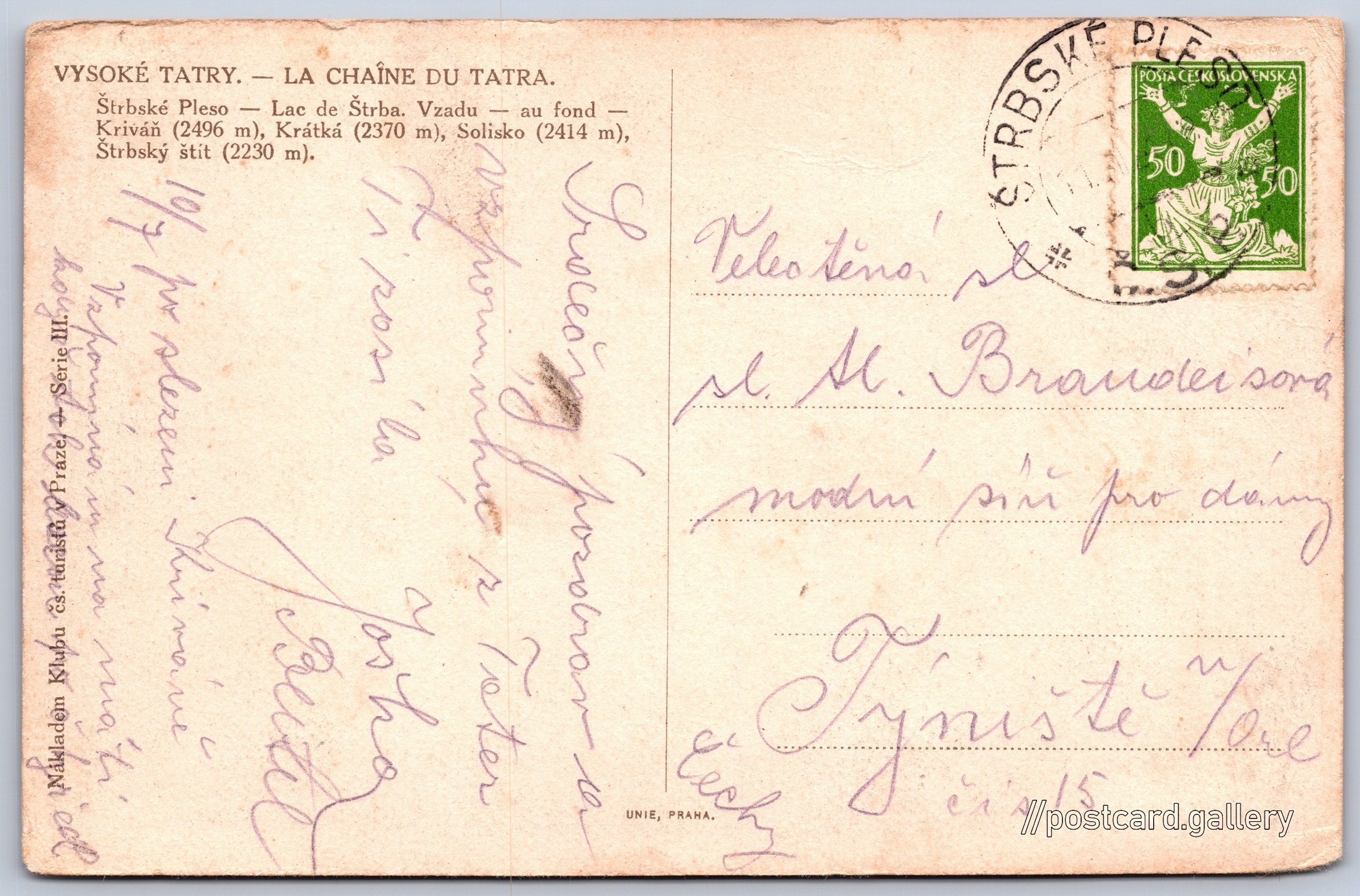 Vysoké Tatry, Štrbské Pleso Pokud chcete vidět pohlednice ve vyšším rozlišení nebo zobrazovat jejich zadní stranu, tak se prosím nejdříve přihlašte Přihlásit Zaregistrovat VYSOKÉ TATRY. - LA CHAÎNE DU TATRA.Štrbské Pleso - Lac de Štrba. Vzadu - au fond - Kriváň (2496 m), Krátká (2370 m), Solisko (2414 m), Štrbský štít (2230 m). Jazyky tištěného textu na pohlednici: slovenština, francouzština Pri jazere 4046/1 ukázat na mapě V blízkém okolí místa zobrazeného na pohlednici lze najít 109 jiných pohlednic. Zobrazit blízké pohlednice Vydavatel: UNIE Praha (Československo)Klub československých turistů (Československo) Datum vydání není známo Pomozte nám odhadnout datum vzniku pohlednice Velikost (š x v) a tvar pohlednice: 139 x 90 mm (5.47" x 3.54"), obdélník Prošlá poštou Ceny: Vyplacené známky: 0,50 Kčs (CSK) DiskuseVložit příspěvek Přidat novou složku ... Spravovat složky ...