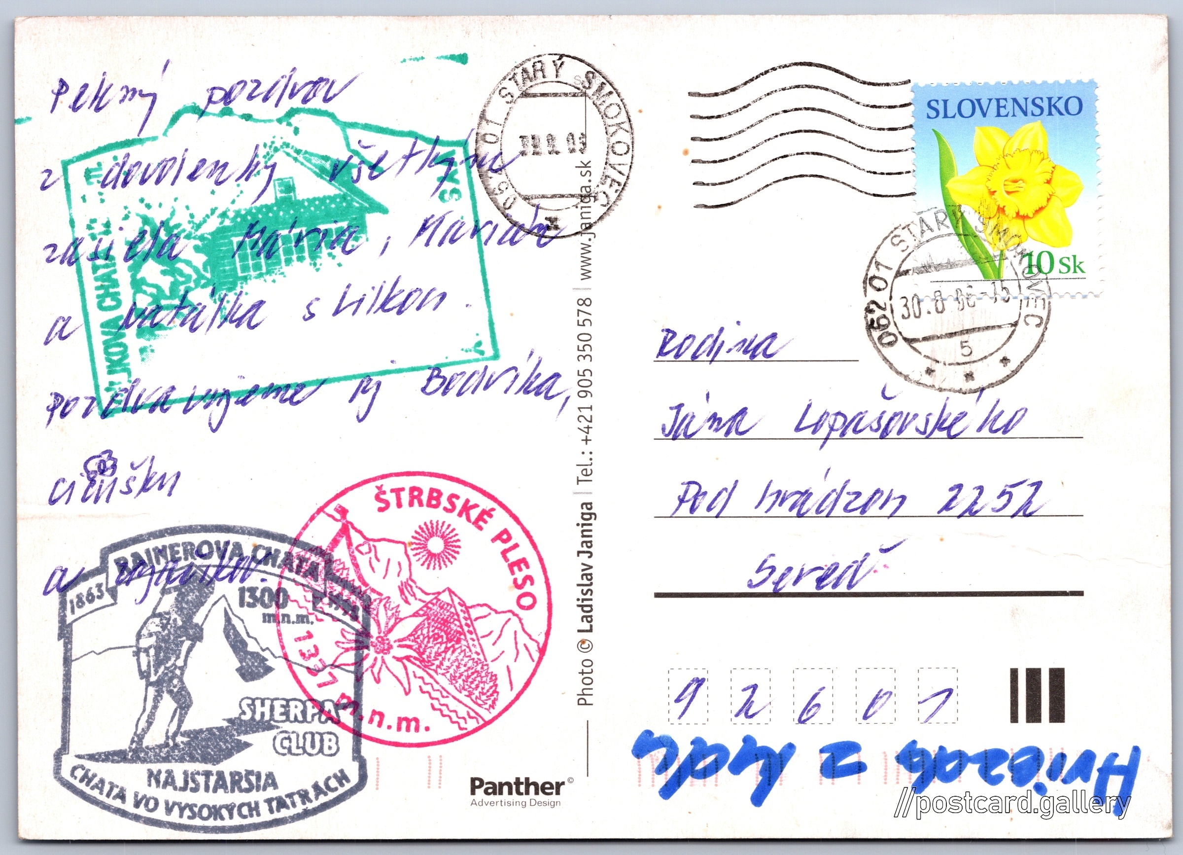 Vysoké Tatry, vodopády Studeného potoka Pokud chcete vidět pohlednice ve vyšším rozlišení nebo zobrazovat jejich zadní stranu, tak se prosím nejdříve přihlašte Přihlásit Zaregistrovat Vysoké Tatry - Slovak RepublicVodopády Studeného potoka Jazyk tištěného textu na pohlednici: slovenština Vodopády Studeného potoka, Vodopád, Vysoké Tatry - Tatranská Lomnica, Slovensko ukázat na mapě V blízkém okolí místa zobrazeného na pohlednici lze najít 155 jiných pohlednic. Zobrazit blízké pohlednice Vydavatel: Ladislav Janiga (Slovensko) Odhadované datum vydání pohlednice: 2003 - 2006 Pomozte nám zpřesnit rok vzniku pohlednice Velikost (š x v) a tvar pohlednice: 148 x 105 mm (5.83" x 4.13"), obdélník Osoby spjaté s touto pohlednicí: Ladislav Janiga(Autor fotografie) Prošlá poštou:Datum na razítku: 30.8.2006 Ceny: Vyplacené známky: 10,00 Sk (SKK) DiskuseVložit příspěvek Přidat novou složku ... Spravovat složky ...