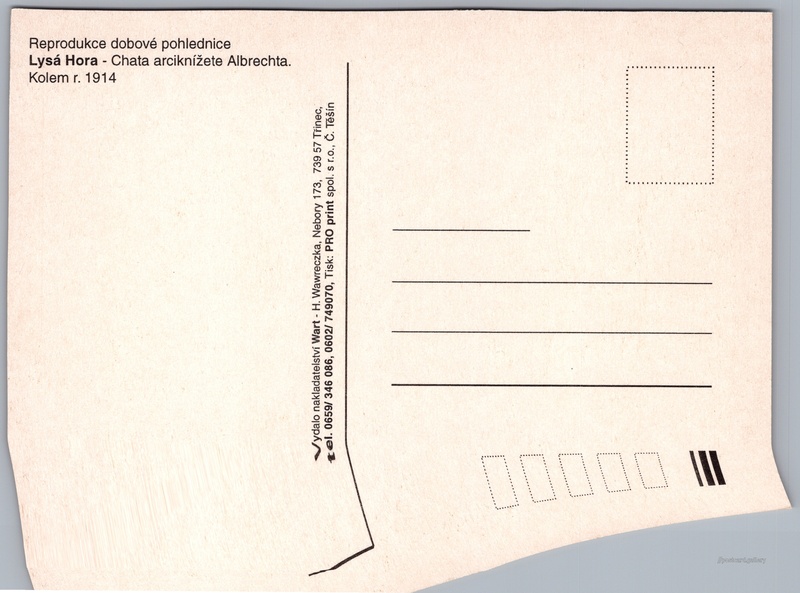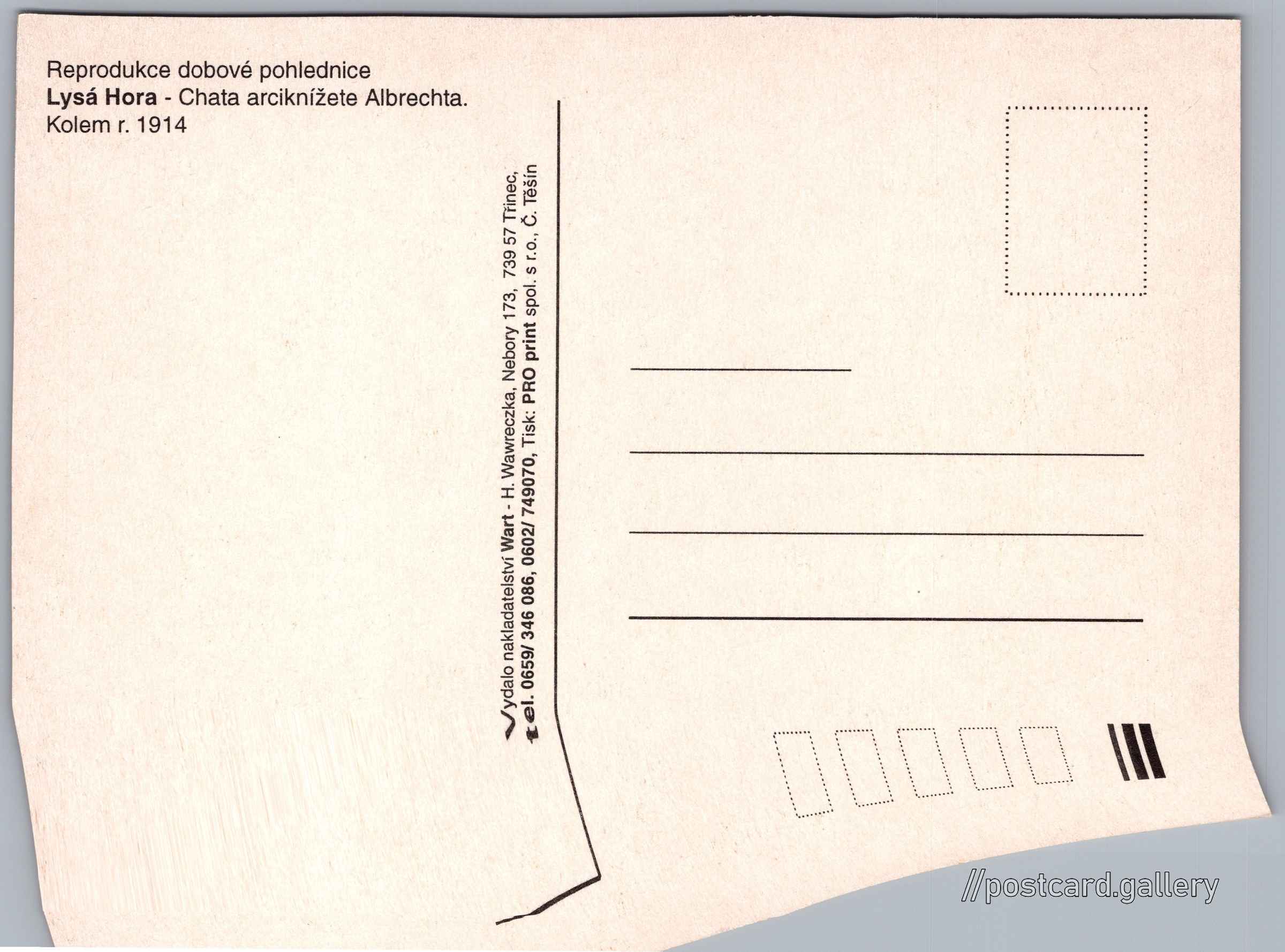 xxx Pokud chcete vidět pohlednice ve vyšším rozlišení nebo zobrazovat jejich zadní stranu, tak se prosím nejdříve přihlašte Přihlásit Zaregistrovat Reprodukce dobové pohledniceLysá Hora - Chata arciknížete Albrechta.Kolem r. 1914 Jazyk tištěného textu na pohlednici: čeština Datum vydání není známo Pomozte nám odhadnout datum vzniku pohlednice Velikost (š x v) a tvar pohlednice: 151 x 112 mm (5.94" x 4.41"), obdélník Čistá pohlednice (neprošlá poštou) DiskuseVložit příspěvek Přidat novou složku ... Spravovat složky ...