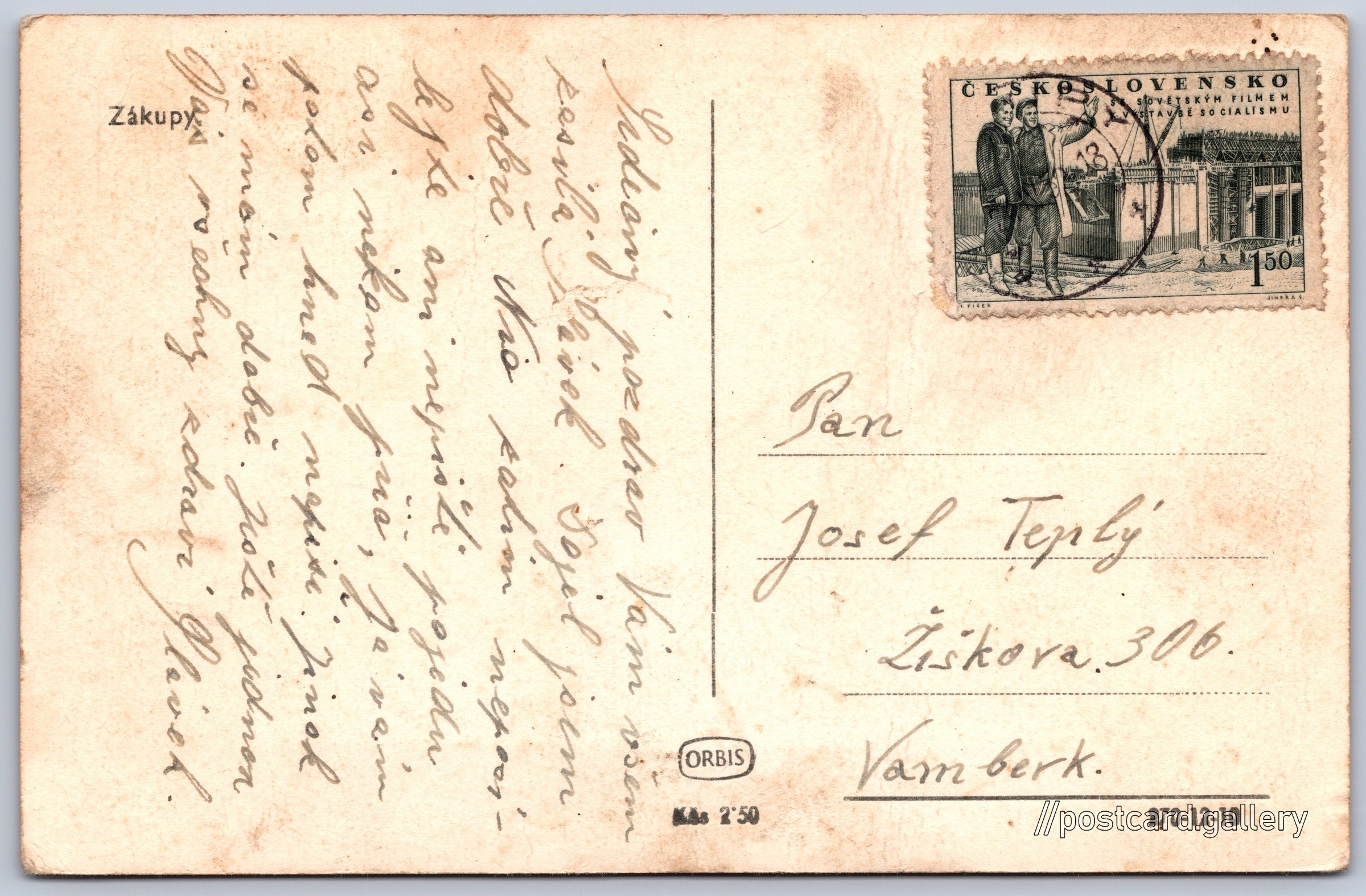 Zákupy Pokud chcete vidět pohlednice ve vyšším rozlišení nebo zobrazovat jejich zadní stranu, tak se prosím nejdříve přihlašte Přihlásit Zaregistrovat Zákupy Jazyk tištěného textu na pohlednici: čeština Zámek Zákupy, Zámek, Borská 1, Zákupy, Česko ukázat na mapě V blízkém okolí místa zobrazeného na pohlednici lze najít 1 jinou pohlednici. Zobrazit blízké pohlednice Vydavatel: Nakladatelství Orbis (Československo) Odhadované datum vydání pohlednice: 1949 - 1952 Pomozte nám zpřesnit rok vzniku pohlednice Velikost (š x v) a tvar pohlednice: 139 x 91 mm (5.47" x 3.58"), obdélník Prošlá poštou:Datum na razítku: 24.4.1952 Ceny: Cena pohlednice: 2,50 Kčs (CSK)Vyplacené známky: 1,50 Kčs (CSK) DiskuseVložit příspěvek Přidat novou složku ... Spravovat složky ...