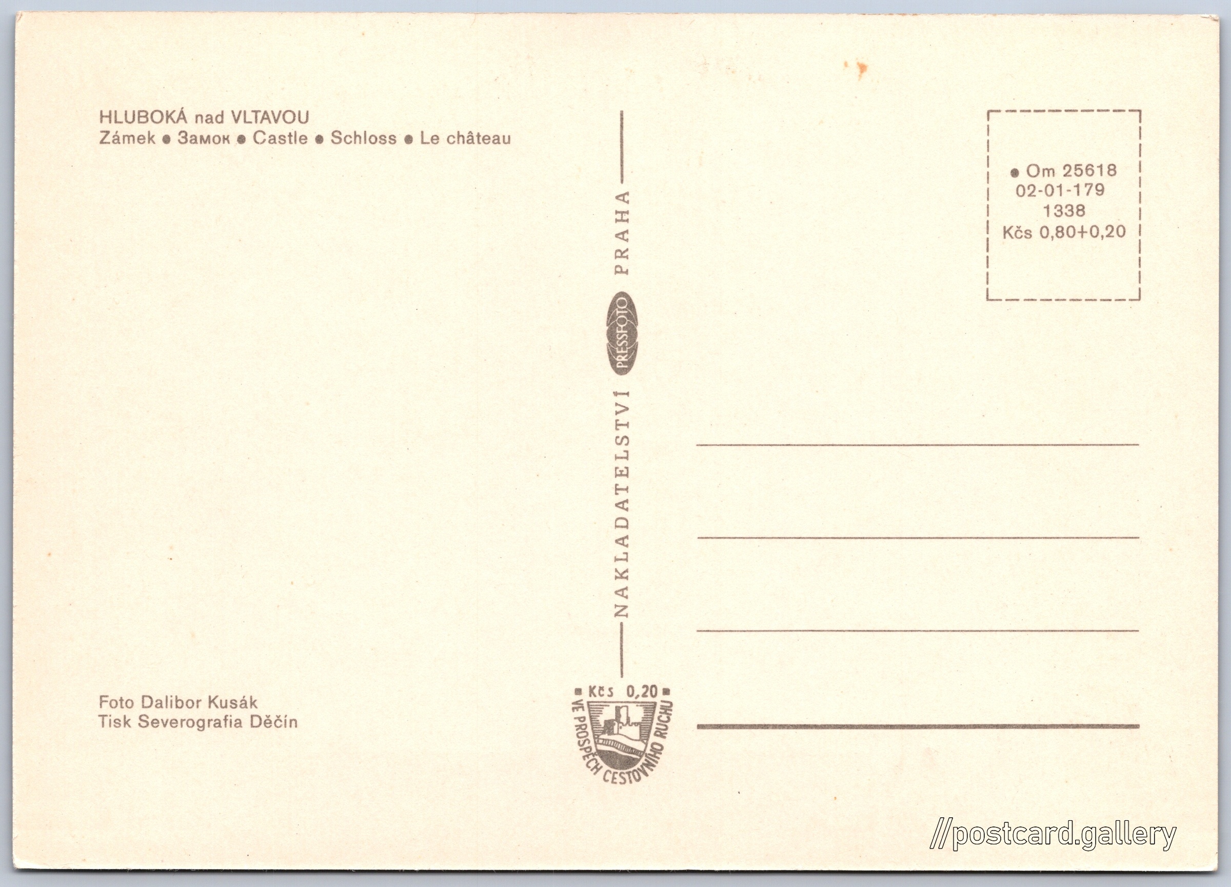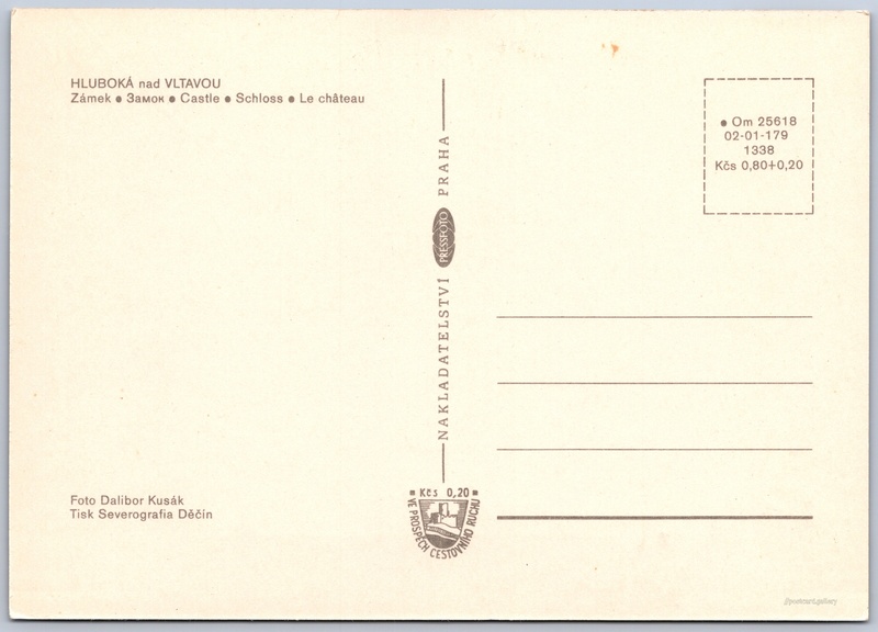 Zámek Hluboká na Vltavou Pokud chcete vidět pohlednice ve vyšším rozlišení nebo zobrazovat jejich zadní stranu, tak se prosím nejdříve přihlašte Přihlásit Zaregistrovat HLUBOKÁ nad VLTAVOU- Zámek- 3aмок- Castle- Schloss- Le château Jazyky tištěného textu na pohlednici: čeština, ruština, angličtina, němčina, francouzština, francouzština Hluboká nad Vltavou, České Budějovice ukázat na mapě V blízkém okolí místa zobrazeného na pohlednici lze najít 12 jiných pohlednic. Zobrazit blízké pohlednice Vydavatel: PressFoto Praha (Československo) Rok vydání pohlednice: 1971 Velikost (š x v) a tvar pohlednice: 148 x 105 mm (5.83" x 4.13"), obdélník Osoby spjaté s touto pohlednicí: Dalibor Kusák(Autor fotografie) Čistá pohlednice (neprošlá poštou) Ceny: Cena pohlednice: 0,80 Kčs (CSK) (+0,20 Kčs přípl. na tur. ruch) Kódy na pohlednici: •Om 25618 02-01-179 1338 DiskuseVložit příspěvek Přidat novou složku ... Spravovat složky ...