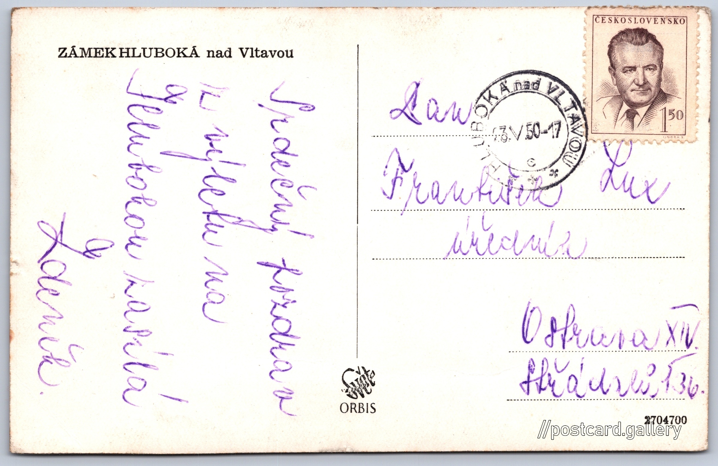 Zámek Hluboká nad Vltavou Pokud chcete vidět pohlednice ve vyšším rozlišení nebo zobrazovat jejich zadní stranu, tak se prosím nejdříve přihlašte Přihlásit Zaregistrovat ZÁMEK HLUBOKÁ nad Vltavou Jazyk tištěného textu na pohlednici: čeština Hluboká nad Vltavou, České Budějovice ukázat na mapě V blízkém okolí místa zobrazeného na pohlednici lze najít 12 jiných pohlednic. Zobrazit blízké pohlednice Vydavatel: Nakladatelství Orbis (Československo) Odhadované datum vydání pohlednice: 1948 - 1950 Pomozte nám zpřesnit rok vzniku pohlednice Velikost (š x v) a tvar pohlednice: 140 x 90 mm (5.51" x 3.54"), obdélník Prošlá poštou:Datum na razítku: 23.5.1950 Ceny: Vyplacené známky: 1,50 Kčs (CSK) Kódy na pohlednici: 2704700 DiskuseVložit příspěvek Přidat novou složku ... Spravovat složky ...