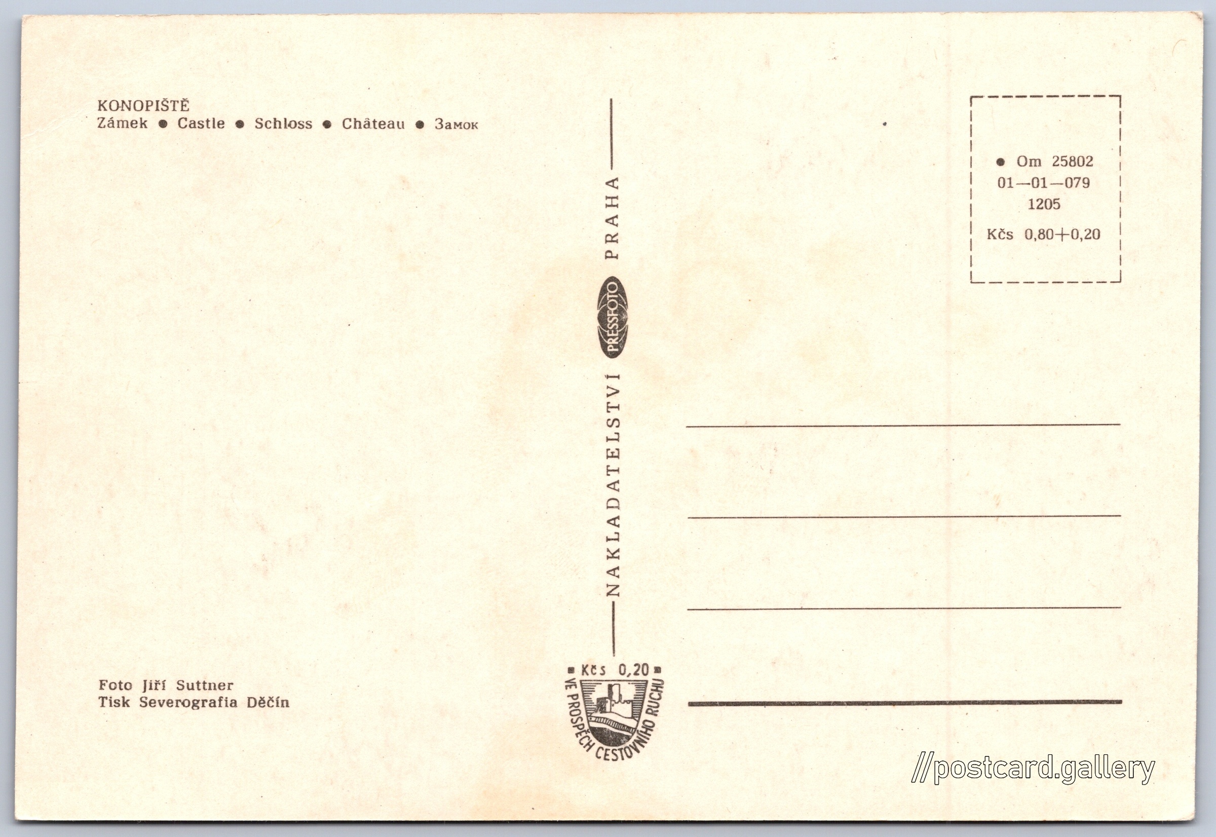 Zámek Konopiště Pokud chcete vidět pohlednice ve vyšším rozlišení nebo zobrazovat jejich zadní stranu, tak se prosím nejdříve přihlašte Přihlásit Zaregistrovat KONOPIŠTĚZámek - Castle - Schloss - Château - 3амок Jazyky tištěného textu na pohlednici: čeština, angličtina, němčina, francouzština, ruština, ruština Konopiště, Benešov, Benešov ukázat na mapě Vydavatel: PressFoto Praha (Československo) Rok vydání pohlednice: 1970 Velikost (š x v) a tvar pohlednice: 147 x 100 mm (5.79" x 3.94"), obdélník Osoby spjaté s touto pohlednicí: Jiří Suttner(Autor fotografie) Čistá pohlednice (neprošlá poštou) Ceny: Cena pohlednice: 0,80 Kčs (CSK) (+0,20 Kčs přípl. na tur. ruch) Kódy na pohlednici: •Om 25802 01-01-079 1205 DiskuseVložit příspěvek Přidat novou složku ... Spravovat složky ...