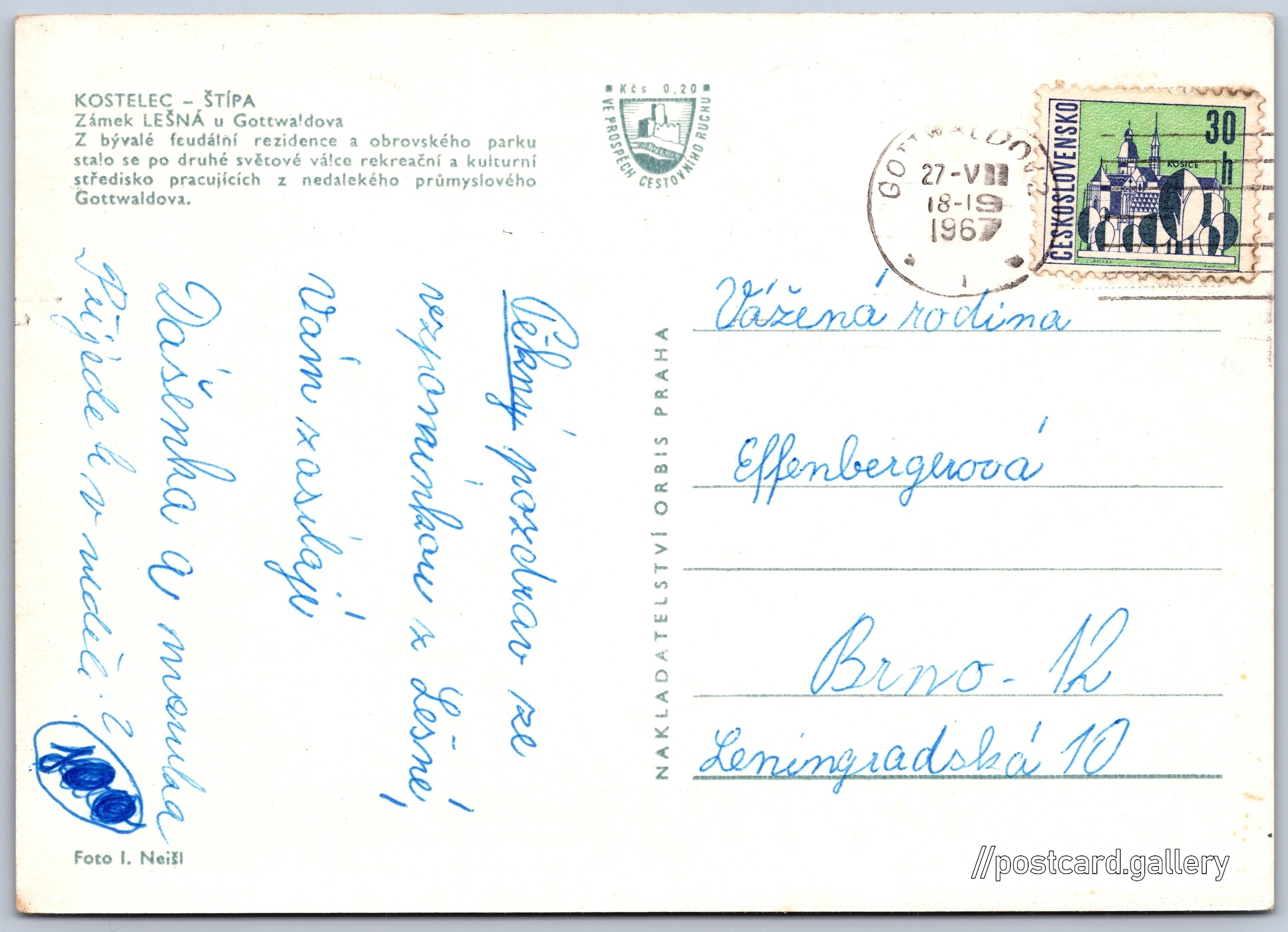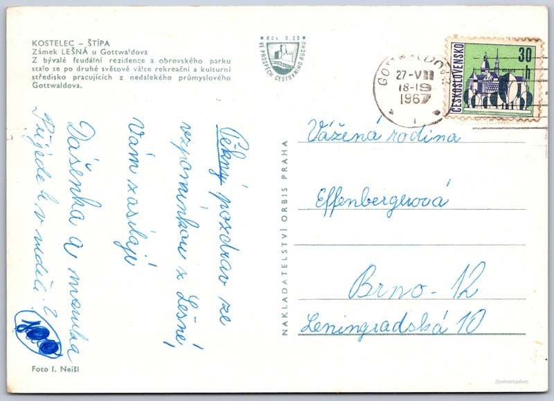 Zámek Lešná Pokud chcete vidět pohlednice ve vyšším rozlišení nebo zobrazovat jejich zadní stranu, tak se prosím nejdříve přihlašte Přihlásit Zaregistrovat KOSTELEC - ŠTÍPAZámek LEŠNÁ u GottwaldovaZ bývalé feudální rezidence a obrovského parku stalo se po druhé světové válce rekreační a kulturní středisko pracujících z nedalekého průmyslového Gottwaldova. Jazyk tištěného textu na pohlednici: čeština Zámek Lešná, Zámek, Lukovská 112, Zlín - Štípa, Česko ukázat na mapě V blízkém okolí místa zobrazeného na pohlednici lze najít 5 jiných pohlednic. Zobrazit blízké pohlednice Vydavatel: Nakladatelství Orbis (Československo) Odhadované datum vydání pohlednice: 1964 - 1967 Pomozte nám zpřesnit rok vzniku pohlednice Velikost (š x v) a tvar pohlednice: 147 x 105 mm (5.79" x 4.13"), obdélník Osoby spjaté s touto pohlednicí: Ivan Neišl(Autor fotografie) Prošlá poštou:Datum na razítku: 27.7.1967 Ceny: Příplatek na tur. ruch: 0,20 Kčs (CSK))Vyplacené známky: 0,30 Kčs (CSK) DiskuseVložit příspěvek Přidat novou složku ... Spravovat složky ...