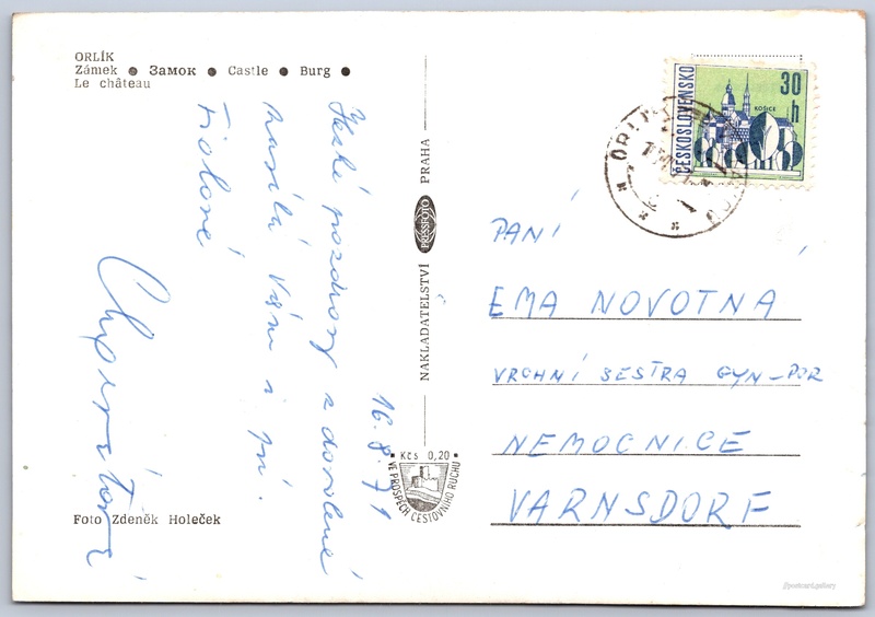 Zámek Orlík Pokud chcete vidět pohlednice ve vyšším rozlišení nebo zobrazovat jejich zadní stranu, tak se prosím nejdříve přihlašte Přihlásit Zaregistrovat ORLİK- Zámek- Замок- Castle- Burg- Le château Jazyk tištěného textu na pohlednici: čeština Zámek Orlík nad Vltavou, Zámek, Orlík nad Vltavou 112, Orlík nad Vltavou, Česko ukázat na mapě V blízkém okolí místa zobrazeného na pohlednici lze najít 15 jiných pohlednic. Zobrazit blízké pohlednice Vydavatel: PressFoto Praha (Československo) Odhadované datum vydání pohlednice: 1965 - 1971 Pomozte nám zpřesnit rok vzniku pohlednice Velikost (š x v) a tvar pohlednice: 148 x 102 mm (5.83" x 4.02"), obdélník Osoby spjaté s touto pohlednicí: Zdeněk Holeček(Autor fotografie) Prošlá poštou:Datum na razítku: 16.8.1971Datum napsání pohledu: 16.8.1971 Ceny: Příplatek na tur. ruch: 0,20 Kčs (CSK))Vyplacené známky: 0,30 Kčs (CSK) DiskuseVložit příspěvek Přidat novou složku ... Spravovat složky ...