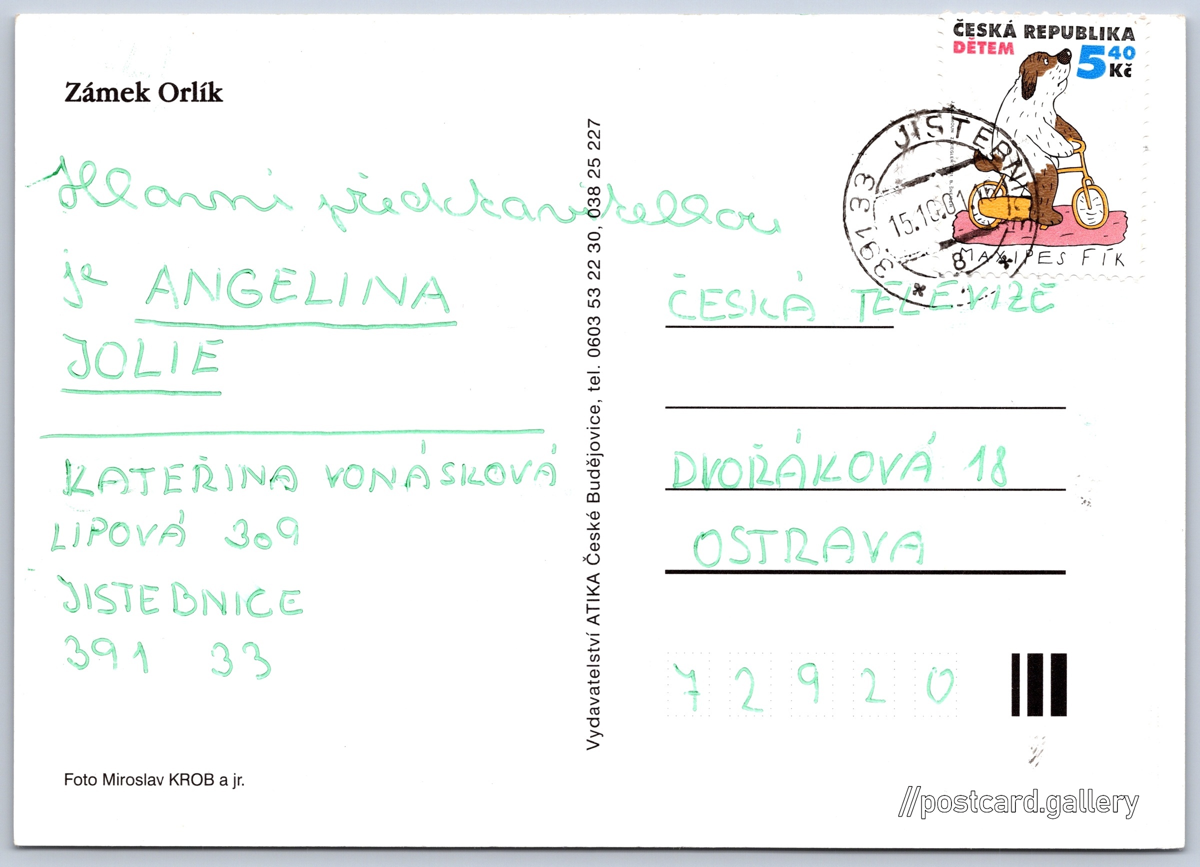 Zámek Orlík Pokud chcete vidět pohlednice ve vyšším rozlišení nebo zobrazovat jejich zadní stranu, tak se prosím nejdříve přihlašte Přihlásit Zaregistrovat Zámek Orlík Zámek Orlík Jazyk tištěného textu na pohlednici: čeština Zámek Orlík nad Vltavou, Zámek, Orlík nad Vltavou 112, Orlík nad Vltavou, Česko ukázat na mapě V blízkém okolí místa zobrazeného na pohlednici lze najít 15 jiných pohlednic. Zobrazit blízké pohlednice Vydavatel: ATIKA České Budějovice (Česko) Odhadované datum vydání pohlednice: 1998 - 2001 Pomozte nám zpřesnit rok vzniku pohlednice Velikost (š x v) a tvar pohlednice: 147 x 105 mm (5.79" x 4.13"), obdélník Osoby spjaté s touto pohlednicí: Miroslav Krob a jr.(Autor fotografie) Prošlá poštou:Datum na razítku: 15.10.2001 Ceny: Vyplacené známky: 5,40 Kč (CZK) DiskuseVložit příspěvek Přidat novou složku ... Spravovat složky ...