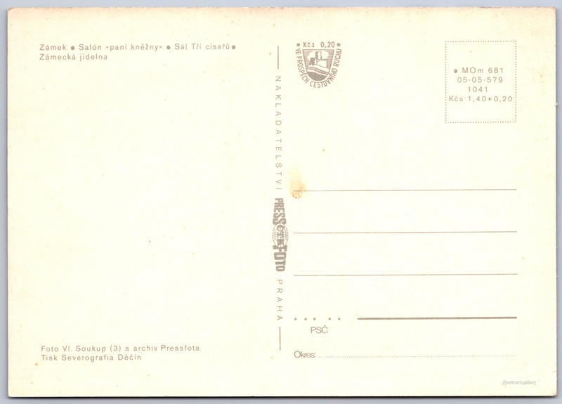 Zámek Ratibořice Pokud chcete vidět pohlednice ve vyšším rozlišení nebo zobrazovat jejich zadní stranu, tak se prosím nejdříve přihlašte Přihlásit Zaregistrovat Ratibořice - Zámek- Salón "paní kněžny"- Sál Tří císařů- Zámecká jídelna Jazyk tištěného textu na pohlednici: čeština Zámek Ratibořice, Zámek, Ratibořice 1, Česká Skalice - Ratibořice, Česko ukázat na mapě V blízkém okolí místa zobrazeného na pohlednici lze najít 17 jiných pohlednic. Zobrazit blízké pohlednice Vydavatel: PressFoto Praha (Československo) Rok vydání pohlednice: 1975 Velikost (š x v) a tvar pohlednice: 147 x 103 mm (5.79" x 4.06"), obdélník Osoby spjaté s touto pohlednicí: Vladimír Soukup(Autor fotografie) Čistá pohlednice (neprošlá poštou) Ceny: Cena pohlednice: 1,40 Kčs (CSK) (+0,20 Kčs přípl. na tur. ruch) Kódy na pohlednici: •MOm 681 05-05-579 1041 DiskuseVložit příspěvek Přidat novou složku ... Spravovat složky ...