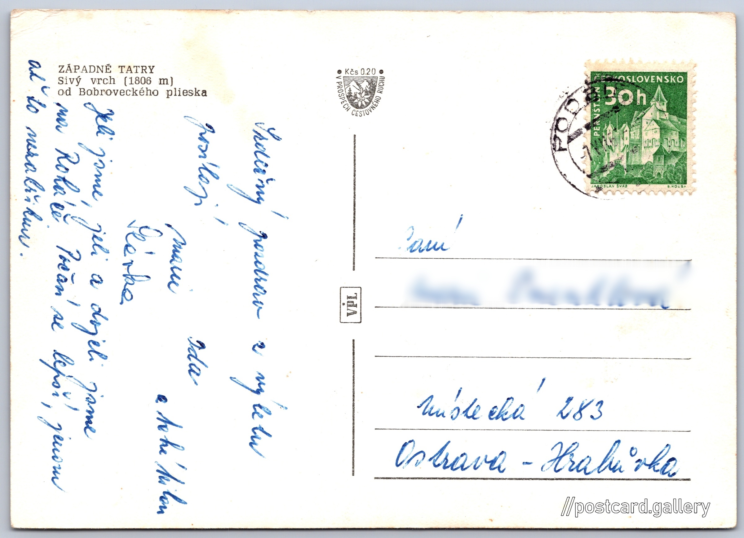 Západní Tatry, Sivý vrch Pokud chcete vidět pohlednice ve vyšším rozlišení nebo zobrazovat jejich zadní stranu, tak se prosím nejdříve přihlašte Přihlásit Zaregistrovat ZÁPADNÉ TATRYSivý vrch [1806 m) od Bobroveckého plesa Jazyk tištěného textu na pohlednici: slovenština Sivý vrch (1805 m), Hora, výškový bod, Zuberec, Slovensko ukázat na mapě V blízkém okolí místa zobrazeného na pohlednici lze najít 3 jiné pohlednice. Zobrazit blízké pohlednice Vydavatel: VPL (Československo) Odhadované datum vydání pohlednice: 1961 - 1965 Pomozte nám zpřesnit rok vzniku pohlednice Velikost (š x v) a tvar pohlednice: 145 x 104 mm (5.71" x 4.09"), obdélník Prošlá poštou Ceny: Příplatek na tur. ruch: 0,20 Kčs (CSK))Vyplacené známky: 0,30 Kčs (CSK) DiskuseVložit příspěvek Přidat novou složku ... Spravovat složky ...