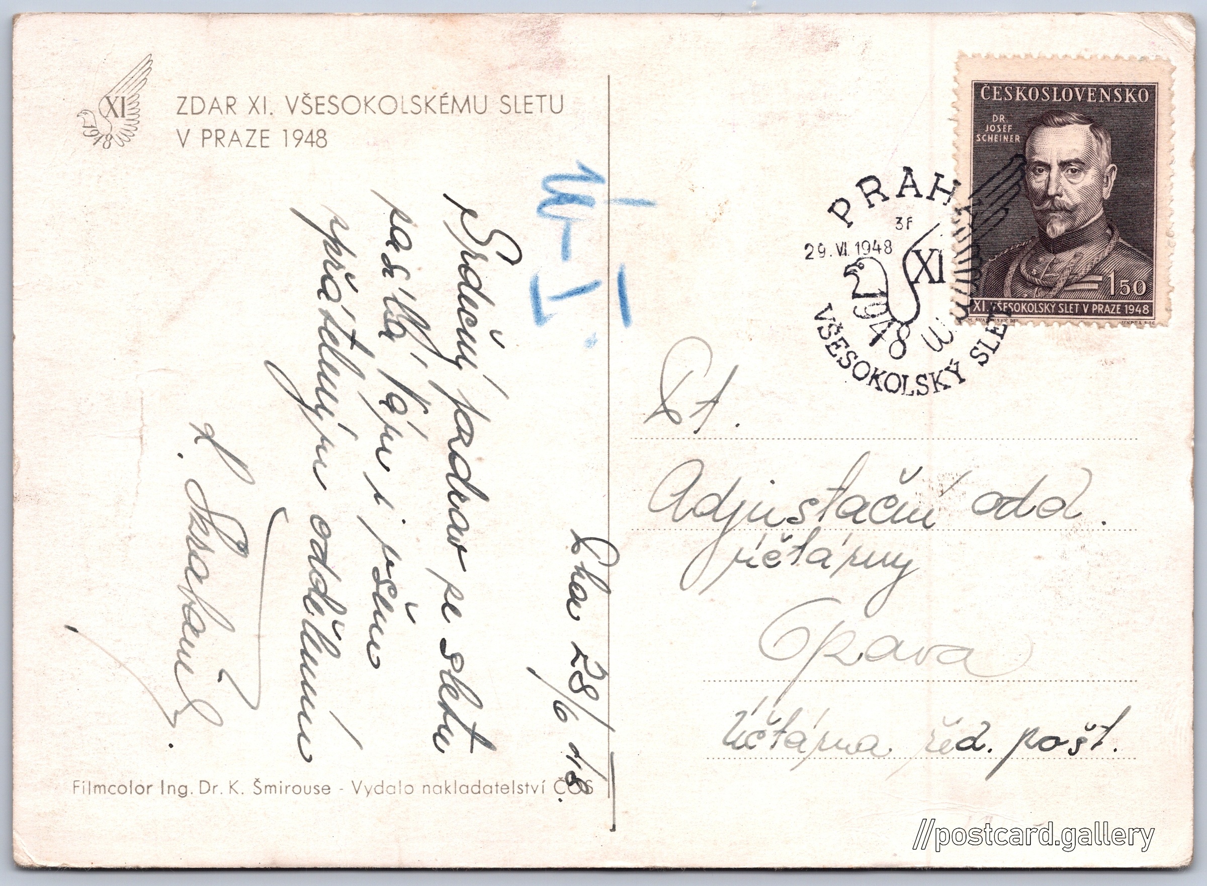 Zdar XI. Všesokolskému sletu Pokud chcete vidět pohlednice ve vyšším rozlišení nebo zobrazovat jejich zadní stranu, tak se prosím nejdříve přihlašte Přihlásit Zaregistrovat ZDAR XI, VŠESOKOLSKÉMU SLETU V PRAZE 1948 Jazyk tištěného textu na pohlednici: čeština Strahovský stadion, Technická památka, Praha - Břevnov, Česko ukázat na mapě Vydavatel: Nakladatelství ČOS (Československo) Odhadované datum vydání pohlednice: 1945 - 1948 Pomozte nám zpřesnit rok vzniku pohlednice Velikost (š x v) a tvar pohlednice: 146 x 106 mm (5.75" x 4.17"), obdélník Prošlá poštou:Datum na razítku: 29.6.1948Datum napsání pohledu: 28.6.1948 Ceny: Vyplacené známky: 1,50 Kčs (CSK) DiskuseVložit příspěvek Přidat novou složku ... Spravovat složky ...