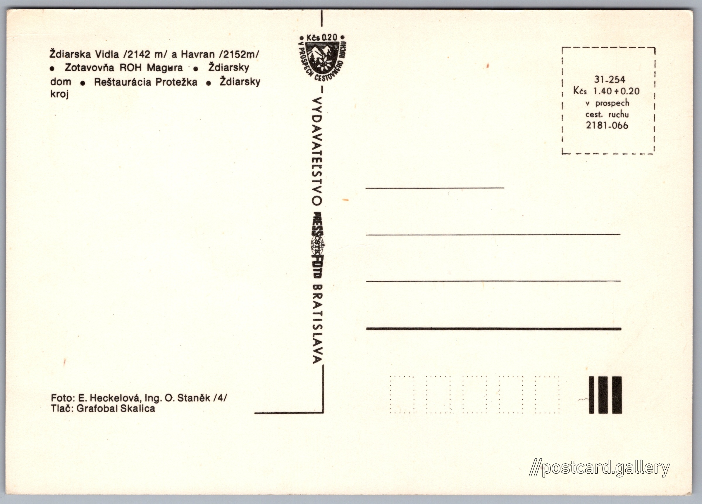 Ždiar 1/2 Pokud chcete vidět pohlednice ve vyšším rozlišení nebo zobrazovat jejich zadní stranu, tak se prosím nejdříve přihlašte Přihlásit Zaregistrovat Ždiar - Ždiarska Vidla /2142 m/ a Havran /2152m/- Zotavovňa ROH Magura- Ždiarsky dom- Reštaurácia Protežka- Ždiarsky kroj Jazyk tištěného textu na pohlednici: slovenština Ždiarska vidla (2142 m), Hora, výškový bod, Ždiar, Slovensko ukázat na mapě V blízkém okolí místa zobrazeného na pohlednici lze najít 27 jiných pohlednic. Zobrazit blízké pohlednice Vydavatel: PressFoto Bratislava (Československo) Rok vydání pohlednice: 1981 Velikost (š x v) a tvar pohlednice: 149 x 105 mm (5.87" x 4.13"), obdélník Osoby spjaté s touto pohlednicí: Oldřich Staněk(Autor fotografie) Eva Heckelová(Autor fotografie) Čistá pohlednice (neprošlá poštou) Ceny: Cena pohlednice: 1,40 Kčs (CSK) (+0,20 Kčs přípl. na tur. ruch) Kódy na pohlednici: 31-254 2181-066 DiskuseVložit příspěvek Přidat novou složku ... Spravovat složky ...