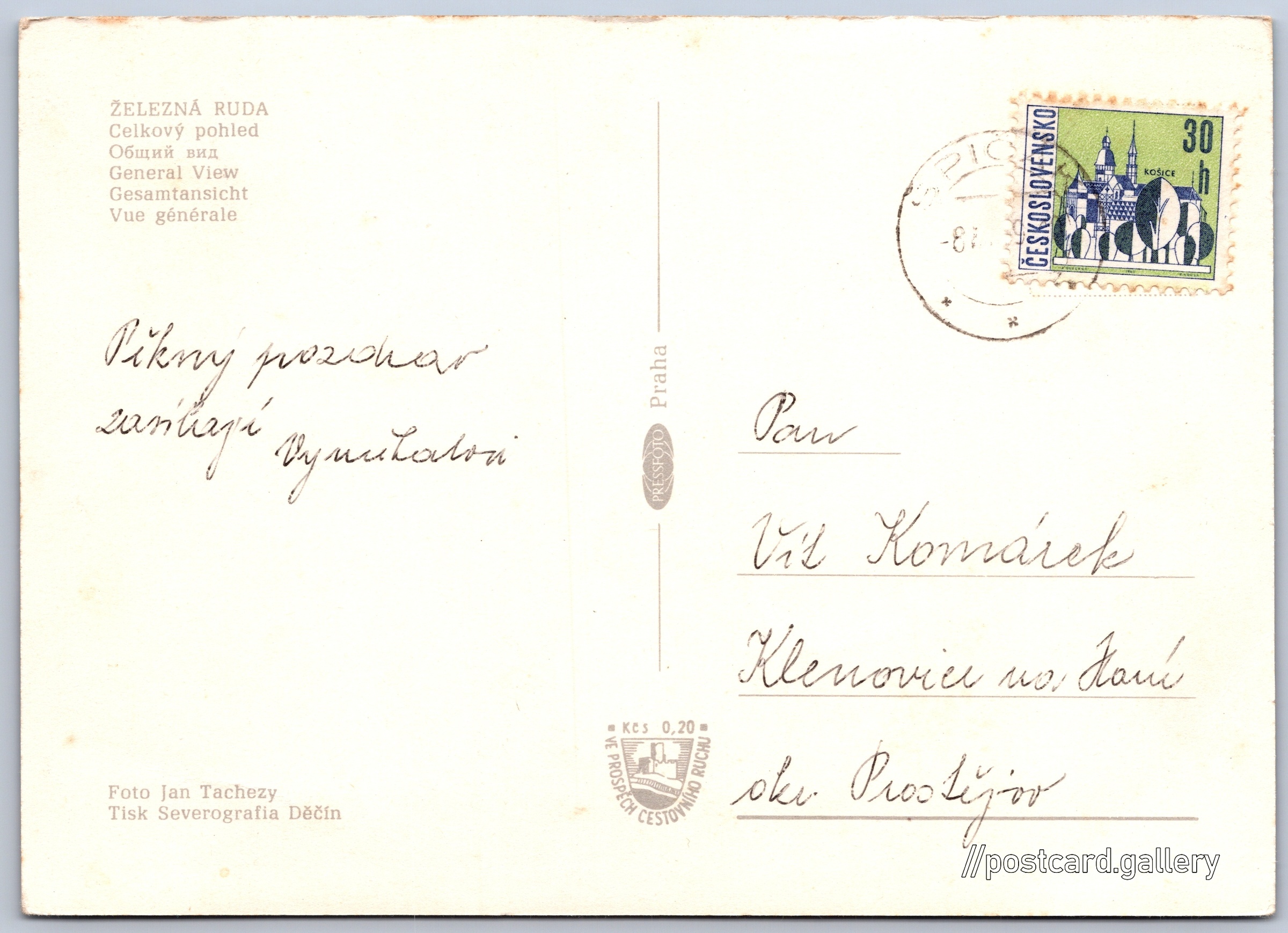 Železná Ruda, celkový pohled Pokud chcete vidět pohlednice ve vyšším rozlišení nebo zobrazovat jejich zadní stranu, tak se prosím nejdříve přihlašte Přihlásit Zaregistrovat ŽELEZNÁ RUDACelkový pohled- Общий вид- General View- Gesamtansicht- Vue générale Jazyky tištěného textu na pohlednici: čeština, ruština, angličtina, němčina, francouzština, francouzština Železná Ruda, Město, Česko ukázat na mapě Vydavatel: PressFoto Praha (Československo) Datum vydání není známo Pomozte nám odhadnout datum vzniku pohlednice Velikost (š x v) a tvar pohlednice: 147 x 105 mm (5.79" x 4.13"), obdélník Osoby spjaté s touto pohlednicí: Jan Tachezy(Autor fotografie) Prošlá poštou Ceny: Příplatek na tur. ruch: 0,20 Kčs (CSK))Vyplacené známky: 0,30 Kčs (CSK) DiskuseVložit příspěvek Přidat novou složku ... Spravovat složky ...