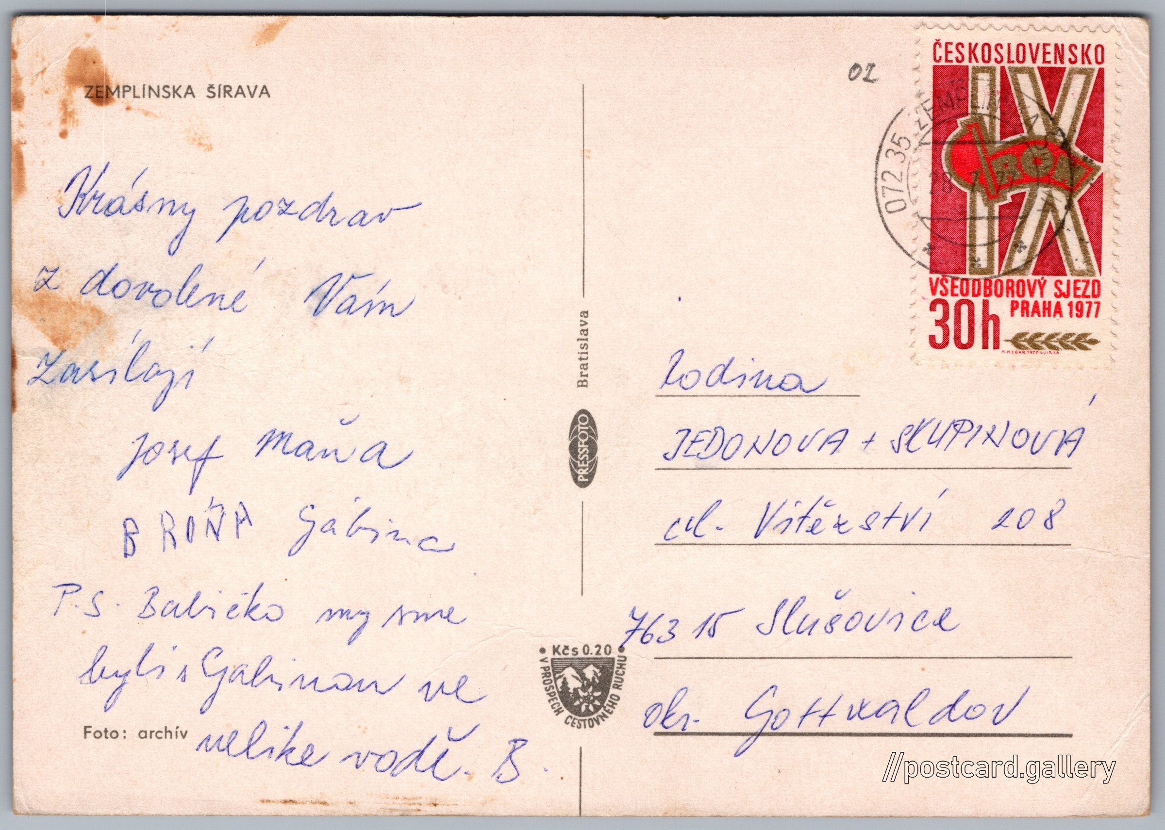 Zemplínska Šírava Pokud chcete vidět pohlednice ve vyšším rozlišení nebo zobrazovat jejich zadní stranu, tak se prosím nejdříve přihlašte Přihlásit Zaregistrovat ZEMPLÍNSKA ŠÍRAVA Jazyk tištěného textu na pohlednici: slovenština Vydavatel: PressFoto Bratislava (Československo) Odhadované datum vydání pohlednice: 1974 - 1977 Pomozte nám zpřesnit rok vzniku pohlednice Velikost (š x v) a tvar pohlednice: 148 x 104 mm (5.83" x 4.09"), obdélník Prošlá poštou:Datum na razítku: 28.7.1977 Ceny: Příplatek na tur. ruch: 0,20 Kčs (CSK))Vyplacené známky: 0,30 Kčs (CSK) DiskuseVložit příspěvek Přidat novou složku ... Spravovat složky ...