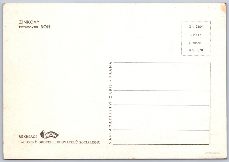 Žinkovy, zotavovna ROH Pokud chcete vidět pohlednice ve vyšším rozlišení nebo zobrazovat jejich zadní stranu, tak se prosím nejdříve přihlašte Přihlásit Zaregistrovat ŽINKOVYzotavovna ROHREKREACE ROHRADOSTNÝ ODDECH BUDOVATELŮ SOCIALISMU Jazyk tištěného textu na pohlednici: čeština Zámek Žinkovy, Zámek, Žinkovy, Česko ukázat na mapě V blízkém okolí místa zobrazeného na pohlednici lze najít 4 jiné pohlednice. Zobrazit blízké pohlednice Vydavatel: Nakladatelství Orbis (Československo) Datum vydání není známo Pomozte nám odhadnout datum vzniku pohlednice Velikost (š x v) a tvar pohlednice: 147 x 102 mm (5.79" x 4.02"), obdélník Čistá pohlednice (neprošlá poštou) Ceny: Cena pohlednice: 0,70 Kčs (CSK) Kódy na pohlednici: 3-2364 021112 F 20568 DiskuseVložit příspěvek Přidat novou složku ... Spravovat složky ...