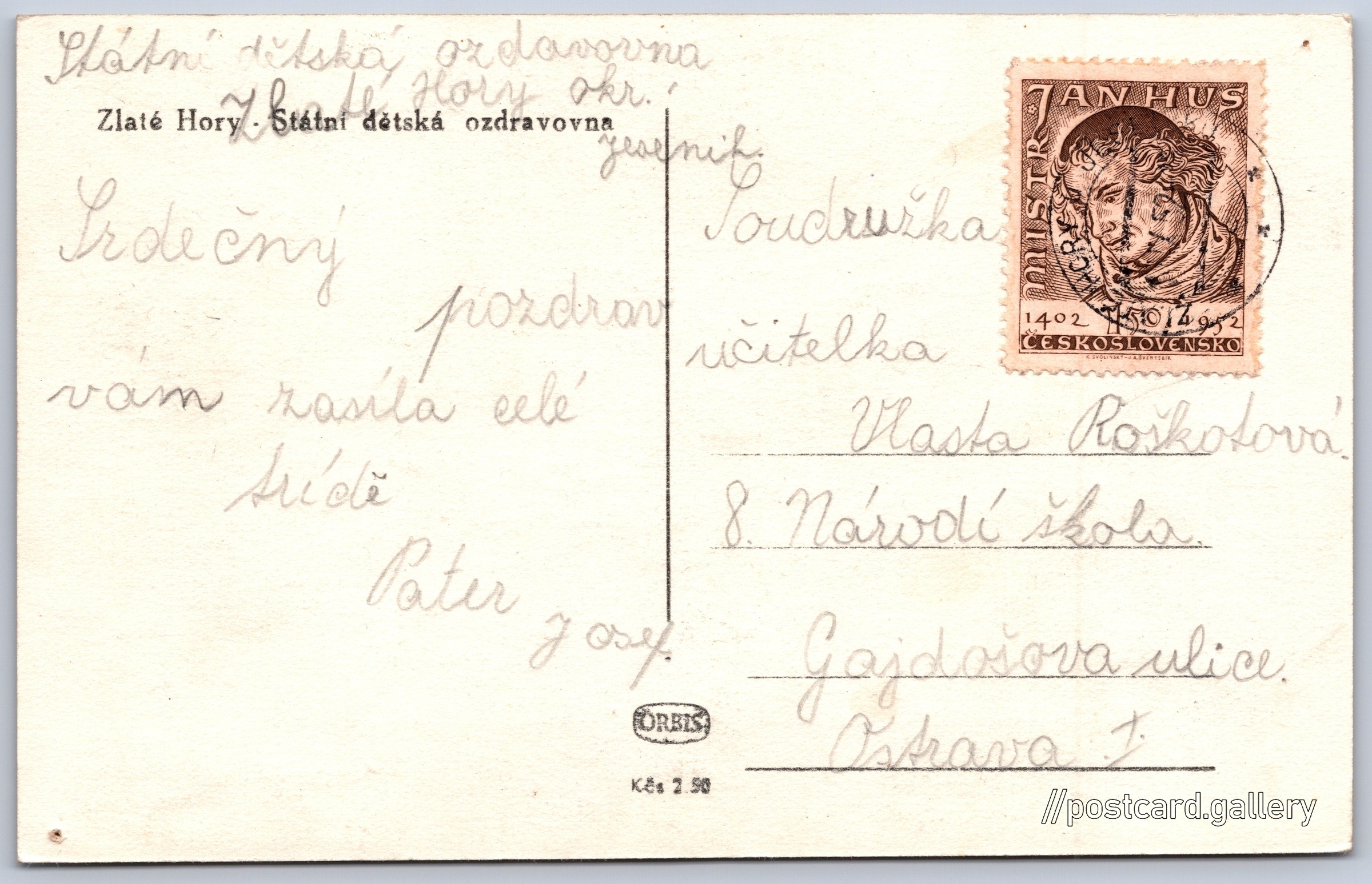 Zlaté Hory, státní dětská ozdravovna Pokud chcete vidět pohlednice ve vyšším rozlišení nebo zobrazovat jejich zadní stranu, tak se prosím nejdříve přihlašte Přihlásit Zaregistrovat Zlaté Hory - Státní dětská ozdravovna Jazyk tištěného textu na pohlednici: čeština Lázeňská, Zlaté Hory, Jeseník ukázat na mapě Vydavatel: Nakladatelství Orbis (Československo) Odhadované datum vydání pohlednice: 1949 - 1952 Pomozte nám zpřesnit rok vzniku pohlednice Velikost (š x v) a tvar pohlednice: 139 x 89 mm (5.47" x 3.50"), obdélník Prošlá poštou Ceny: Cena pohlednice: 2,50 Kčs (CSK)Vyplacené známky: 1,50 Kčs (CSK) DiskuseVložit příspěvek Přidat novou složku ... Spravovat složky ...