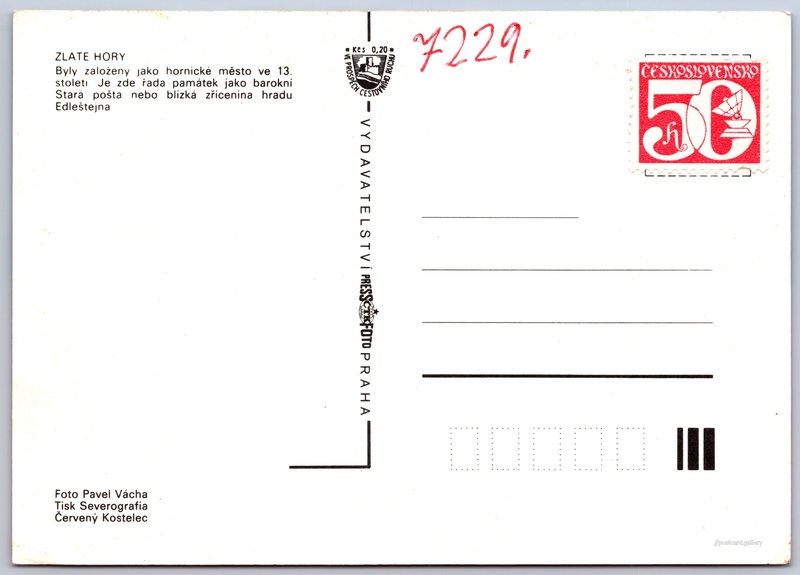 Zlaté Hory Pokud chcete vidět pohlednice ve vyšším rozlišení nebo zobrazovat jejich zadní stranu, tak se prosím nejdříve přihlašte Přihlásit Zaregistrovat Zlaté Hory ZLATE HORYByly založeny jako hornické město ve 13. století. Je zde řada památek jako barokní Stará pošta nebo blízká zřícenina hradu Edleštejna. Jazyk tištěného textu na pohlednici: čeština Zlaté Hory, Město, Česko ukázat na mapě Vydavatel: PressFoto Praha (Československo) Datum vydání není známo Pomozte nám odhadnout datum vzniku pohlednice Velikost (š x v) a tvar pohlednice: 148 x 105 mm (5.83" x 4.13"), obdélník Osoby spjaté s touto pohlednicí: Pavel Vácha(Autor fotografie) Čistá pohlednice (neprošlá poštou) Ceny: Příplatek na tur. ruch: 0,20 Kčs (CSK))Vyplacené známky: 0,50 Kčs (CSK) DiskuseVložit příspěvek Přidat novou složku ... Spravovat složky ...
