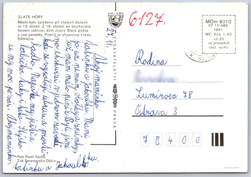 Zlaté Hory Pokud chcete vidět pohlednice ve vyšším rozlišení nebo zobrazovat jejich zadní stranu, tak se prosím nejdříve přihlašte Přihlásit Zaregistrovat Zlaté Hory ZLATÉ HORYMěsto bylo založeno při zlatých dolech ve 13. století. Z 18. století se dochovala barokní radnice, dům zvaný Stará pošta a jiné památky. Poblíž je zřícenina hradu Edlštejna. Jazyk tištěného textu na pohlednici: čeština Zlaté Hory, Město, Česko ukázat na mapě Vydavatel: PressFoto Praha (Československo) Rok vydání pohlednice: 1984 Velikost (š x v) a tvar pohlednice: 148 x 103 mm (5.83" x 4.06"), obdélník Osoby spjaté s touto pohlednicí: Pavel Vácha(Autor fotografie) Prošlá poštou Ceny: Cena pohlednice: 1,40 Kčs (CSK) (+0,20 Kčs přípl. na tur. ruch) Kódy na pohlednici: MOm 8310 07-10-489 1961 DiskuseVložit příspěvek Přidat novou složku ... Spravovat složky ...