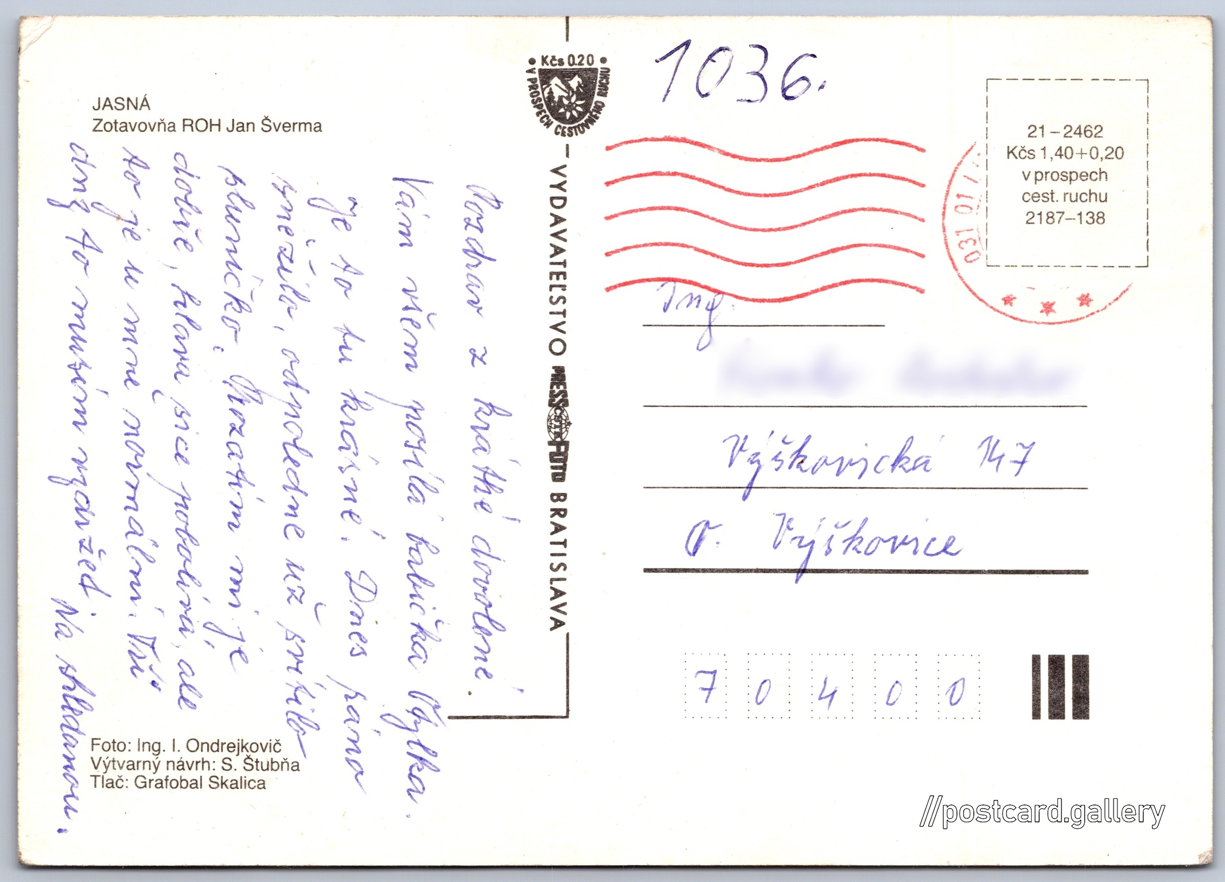 Zotavovna ROH Jan Šverma Pokud chcete vidět pohlednice ve vyšším rozlišení nebo zobrazovat jejich zadní stranu, tak se prosím nejdříve přihlašte Přihlásit Zaregistrovat Zotavovňa ROH Jan Šverma JASNÁZotavovňa ROH Jan Šverma Jazyk tištěného textu na pohlednici: slovenština Hotel SOREA MARMOT, Jasná pod Chopkom 104, Demänovská Dolina, Slovensko ukázat na mapě Vydavatel: PressFoto Bratislava (Československo) Rok vydání pohlednice: 1987 Velikost (š x v) a tvar pohlednice: 148 x 105 mm (5.83" x 4.13"), obdélník Osoby spjaté s touto pohlednicí: S. Štubňa(Design pohlednice) Ivan Ondrejkovič(Autor fotografie) Jan Šverma(Obsah pohlednice) Prošlá poštou Ceny: Cena pohlednice: 1,40 Kčs (CSK) (+0,20 Kčs přípl. na tur. ruch) Kódy na pohlednici: 21-2462 2187-138 DiskuseVložit příspěvek Přidat novou složku ... Spravovat složky ...