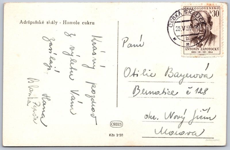 Adršpašské skály, Homole cukru Pokud chcete vidět pohlednice ve vyšším rozlišení nebo zobrazovat jejich zadní stranu, tak se prosím nejdříve přihlašte Přihlásit Zaregistrovat Adršpašské skály - Homole cukru Jazyk tištěného textu na pohlednici: čeština Skalní útvar Homole cukru, Skalní útvar, Adršpach - Dolní Adršpach, Česko ukázat na mapě V blízkém okolí místa zobrazeného na pohlednici lze najít 7 jiných pohlednic. Zobrazit blízké pohlednice Vydavatel: Nakladatelství Orbis (Československo) Odhadované datum vydání pohlednice: 1950 - 1953 Pomozte nám zpřesnit rok vzniku pohlednice Velikost (š x v) a tvar pohlednice: 140 x 90 mm (5.51" x 3.54"), obdélník Prošlá poštou:Datum na razítku: 23.5.1955 Ceny: Cena pohlednice: 2,50 Kčs (CSK)Vyplacené známky: 0,30 Kčs (CSK) DiskuseVložit příspěvek Přidat novou složku ... Spravovat složky ...
