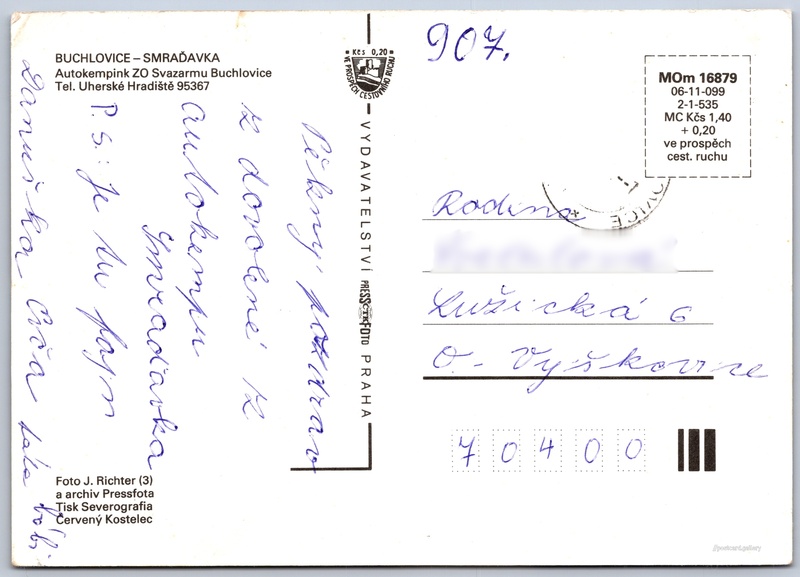 Autocamping Smraďavka Pokud chcete vidět pohlednice ve vyšším rozlišení nebo zobrazovat jejich zadní stranu, tak se prosím nejdříve přihlašte Přihlásit Zaregistrovat Autocamping SmraďavkaSvazarm BUCHLOVICE - SMRAĎAVKAAutokempink ZO Svazarmu BuchloviceTel. Uherské Hradiště 95367 Jazyk tištěného textu na pohlednici: čeština Smraďavka 540, Buchlovice, 687 08, Uherské Hradiště ukázat na mapě Vydavatel: PressFoto Praha (Československo) Rok vydání pohlednice: 1990 Velikost (š x v) a tvar pohlednice: 148 x 105 mm (5.83" x 4.13"), obdélník Osoby spjaté s touto pohlednicí: Jindřich Richter(Autor fotografie) Prošlá poštou Ceny: Cena pohlednice: 1,40 Kčs (CSK) (+0,20 Kčs přípl. na tur. ruch) Kódy na pohlednici: MOm 16879 06-11-099 2-1-535 DiskuseVložit příspěvek Přidat novou složku ... Spravovat složky ...