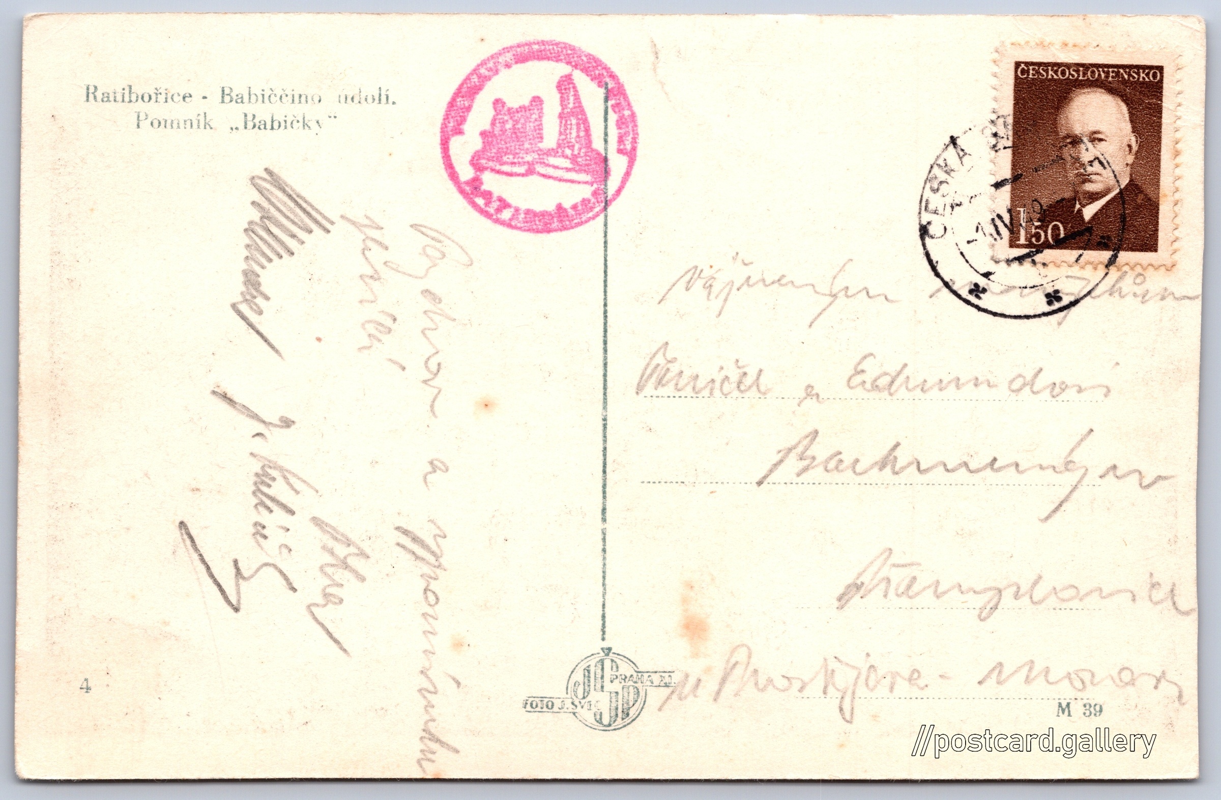 Babiččino údolí, pomník Babičky Pokud chcete vidět pohlednice ve vyšším rozlišení nebo zobrazovat jejich zadní stranu, tak se prosím nejdříve přihlašte Přihlásit Zaregistrovat Ratibořice - Babiččino údolí.Pomník "Babičky" Jazyk tištěného textu na pohlednici: čeština Pomník Babička s dětmi, Pomník, památník, Česká Skalice - Ratibořice, Česko ukázat na mapě V blízkém okolí místa zobrazeného na pohlednici lze najít 17 jiných pohlednic. Zobrazit blízké pohlednice Vydavatel: Foto J. Švec (Československo) Odhadované datum vydání pohlednice: 1946 - 1949 Pomozte nám zpřesnit rok vzniku pohlednice Velikost (š x v) a tvar pohlednice: 138 x 89 mm (5.43" x 3.50"), obdélník Prošlá poštou:Datum na razítku: 1.4.1949 Ceny: Vyplacené známky: 1,50 Kčs (CSK) DiskuseVložit příspěvek Přidat novou složku ... Spravovat složky ...