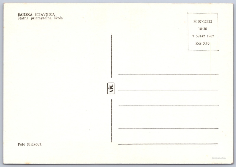 Banská Štiavnica, průmyslová škola Pokud chcete vidět pohlednice ve vyšším rozlišení nebo zobrazovat jejich zadní stranu, tak se prosím nejdříve přihlašte Přihlásit Zaregistrovat BANSKÁ ŠTIAVNICAŠtátna priemyselná škola Jazyk tištěného textu na pohlednici: slovenština Banská Štiavnica ukázat na mapě V blízkém okolí místa zobrazeného na pohlednici lze najít 8 jiných pohlednic. Zobrazit blízké pohlednice Vydavatel: VPL (Československo) Rok vydání pohlednice: prosinec, 1962 Velikost (š x v) a tvar pohlednice: 145 x 101 mm (5.71" x 3.98"), obdélník Osoby spjaté s touto pohlednicí: Plicková(Autor fotografie) Čistá pohlednice (neprošlá poštou) Ceny: Cena pohlednice: 0,70 Kčs (CSK) Kódy na pohlednici: M 07-12822 10-36 3 59142 1262 DiskuseVložit příspěvek Přidat novou složku ... Spravovat složky ...