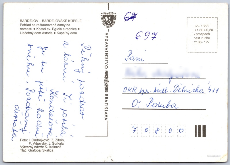 Bardějov Pokud chcete vidět pohlednice ve vyšším rozlišení nebo zobrazovat jejich zadní stranu, tak se prosím nejdříve přihlašte Přihlásit Zaregistrovat BARDEJOV - BARDEJOVSKÉ KÚPELE- Pohľad na reštaurované domy na námestí- Kostol sv. Egídia a radnica- Liečebný dom Astória- Kúpeľný dom Jazyk tištěného textu na pohlednici: slovenština Radničné námestie 37/37 ukázat na mapě Vydavatel: PressFoto Bratislava (Československo) Rok vydání pohlednice: 1986 Velikost (š x v) a tvar pohlednice: 148 x 105 mm (5.83" x 4.13"), obdélník Osoby spjaté s touto pohlednicí: J. Šurkala(Autor fotografie) Z. Zibrin(Autor fotografie) František Vrbovský(Autor fotografie) K. Izakovič(Design pohlednice) Ivan Ondrejkovič(Autor fotografie) Prošlá poštou Ceny: Cena pohlednice: 1,80 Kčs (CSK) (+0,20 Kčs přípl. na tur. ruch) Kódy na pohlednici: 45-1353 2186-127 DiskuseVložit příspěvek Přidat novou složku ... Spravovat složky ...