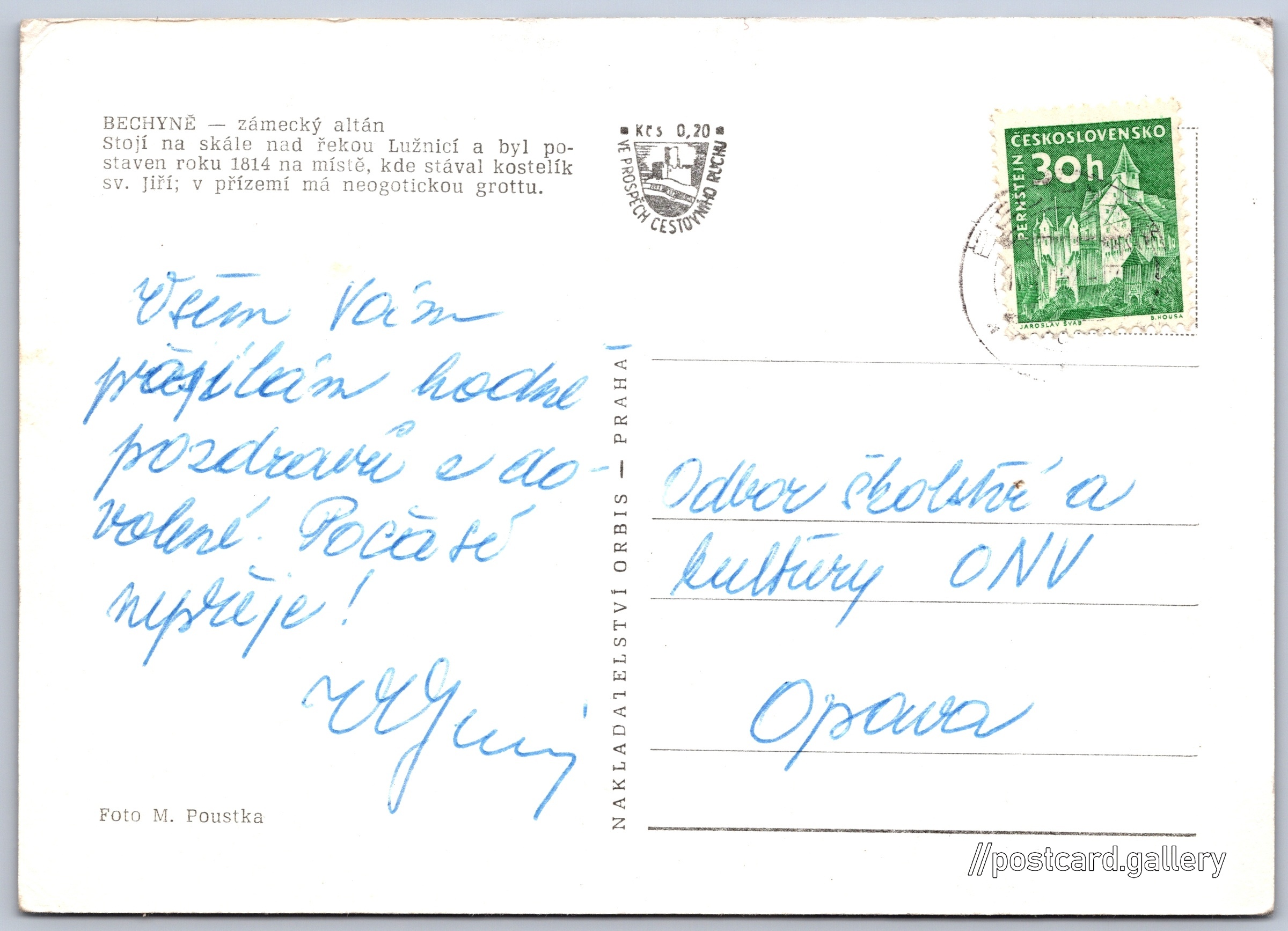 Bechyně, zámecký altán Pokud chcete vidět pohlednice ve vyšším rozlišení nebo zobrazovat jejich zadní stranu, tak se prosím nejdříve přihlašte Přihlásit Zaregistrovat BECHYNĚ - zámecký altánStojí na skále nad řekou Lužnicí a byl postaven roku 1814 na místě, kde stával kostelík sv. Jiří; v přízemí má neogotickou grottu. Jazyk tištěného textu na pohlednici: čeština Zářečí, Bechyně, Tábor ukázat na mapě V blízkém okolí místa zobrazeného na pohlednici lze najít 7 jiných pohlednic. Zobrazit blízké pohlednice Vydavatel: Nakladatelství Orbis (Československo) Odhadované datum vydání pohlednice: 1960 - 1965 Pomozte nám zpřesnit rok vzniku pohlednice Velikost (š x v) a tvar pohlednice: 145 x 103 mm (5.71" x 4.06"), obdélník Osoby spjaté s touto pohlednicí: Miroslav Poustka(Autor fotografie) Prošlá poštou Ceny: Příplatek na tur. ruch: 0,20 Kčs (CSK))Vyplacené známky: 0,30 Kčs (CSK) DiskuseVložit příspěvek Přidat novou složku ... Spravovat složky ...
