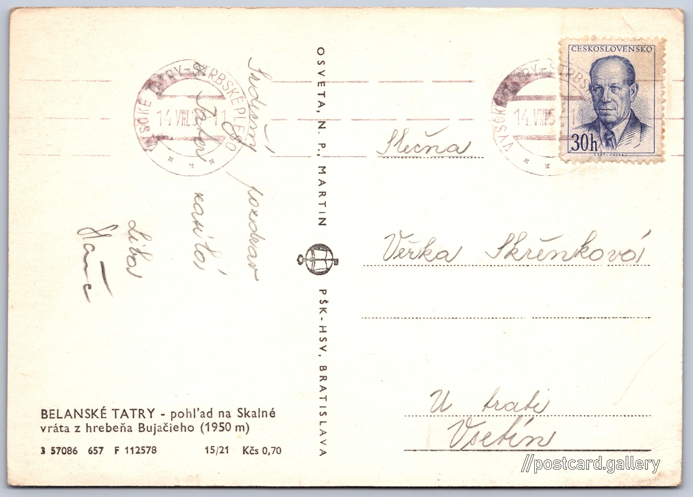 Belanské Tatry, Skalné vráta 7/8 Pokud chcete vidět pohlednice ve vyšším rozlišení nebo zobrazovat jejich zadní stranu, tak se prosím nejdříve přihlašte Přihlásit Zaregistrovat BELANSKÉ TATRY - pohl'ad na Skalné vráta z hrebeňa Bujačieho (1950 m) Jazyk tištěného textu na pohlednici: slovenština Skalné vráta (1620 m), Hora, výškový bod, Vysoké Tatry - Tatranská Lomnica, Slovensko ukázat na mapě V blízkém okolí místa zobrazeného na pohlednici lze najít 34 jiných pohlednic. Zobrazit blízké pohlednice Vydavatel: Osveta, n. p., Martin PŠK - Bratislava (Československo) Rok vydání pohlednice: červen, 1957 Velikost (š x v) a tvar pohlednice: 147 x 104 mm (5.79" x 4.09"), obdélník Prošlá poštou:Datum na razítku: 14.8.1957 Ceny: Cena pohlednice: 0,70 Kčs (CSK)Vyplacené známky: 0,30 Kčs (CSK) Kódy na pohlednici: 3 57086 657 F 112578 15/21 DiskuseVložit příspěvek Přidat novou složku ... Spravovat složky ...