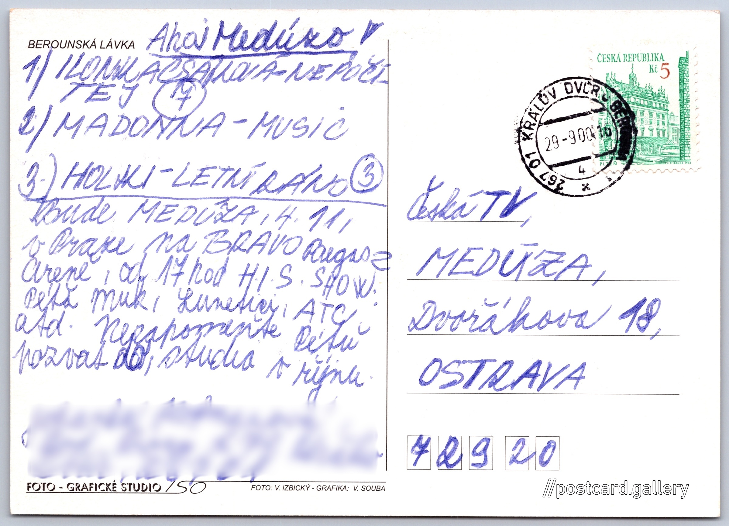 Berounská lávka 4/5 Pokud chcete vidět pohlednice ve vyšším rozlišení nebo zobrazovat jejich zadní stranu, tak se prosím nejdříve přihlašte Přihlásit Zaregistrovat BEROUNSKÁ LÁVKA Jazyk tištěného textu na pohlednici: čeština Beroun-Závodí, Beroun, Beroun ukázat na mapě V blízkém okolí místa zobrazeného na pohlednici lze najít 5 jiných pohlednic. Zobrazit blízké pohlednice Vydavatel: Foto - Grafické Studio SO (Česko) Odhadované datum vydání pohlednice: 1997 - 2000 Pomozte nám zpřesnit rok vzniku pohlednice Velikost (š x v) a tvar pohlednice: 148 x 105 mm (5.83" x 4.13"), obdélník Osoby spjaté s touto pohlednicí: V. Souba(Design pohlednice) V. Izbický(Autor fotografie) Prošlá poštou:Datum na razítku: 29.9.2000 Ceny: Vyplacené známky: 5,00 Kč (CZK) DiskuseVložit příspěvek Přidat novou složku ... Spravovat složky ...