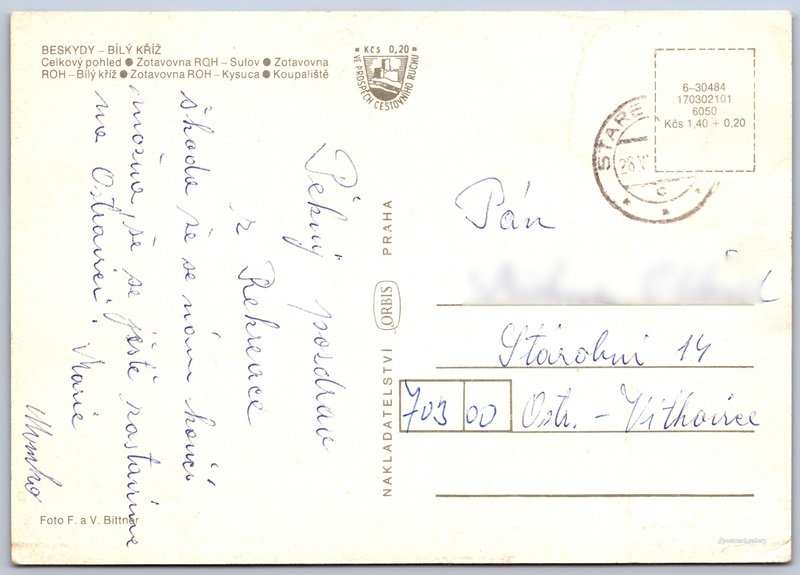 Beskydy, Bílý Kříž Pokud chcete vidět pohlednice ve vyšším rozlišení nebo zobrazovat jejich zadní stranu, tak se prosím nejdříve přihlašte Přihlásit Zaregistrovat Beskydy - Bílý Kříž BESKYDY - BÍLÝ KŘÍŽ- Celkový pohled- Zotavovna ROH - Sulov- Zotavovna ROH - Bílý kříž- Zotavovna ROH - Kysuca- Koupaliště Jazyk tištěného textu na pohlednici: čeština Staré Hamry, Frýdek-Místek ukázat na mapě Vydavatel: Nakladatelství Orbis (Československo) Datum vydání není známo Pomozte nám odhadnout datum vzniku pohlednice Velikost (š x v) a tvar pohlednice: 147 x 103 mm (5.79" x 4.06"), obdélník Osoby spjaté s touto pohlednicí: Vl. Bittner(Autor fotografie) Fr. Bittner(Autor fotografie) Prošlá poštou Ceny: Cena pohlednice: 1,40 Kčs (CSK) (+0,20 Kčs přípl. na tur. ruch) Kódy na pohlednici: 6-30484 170302101 6050 DiskuseVložit příspěvek Přidat novou složku ... Spravovat složky ...