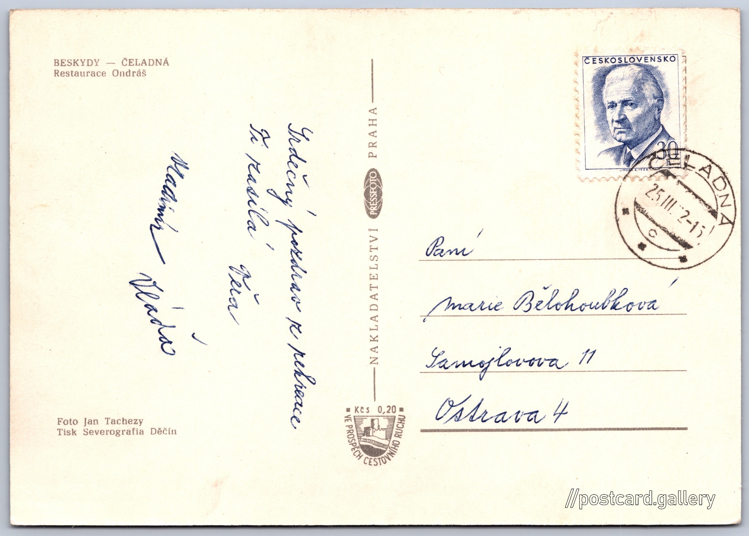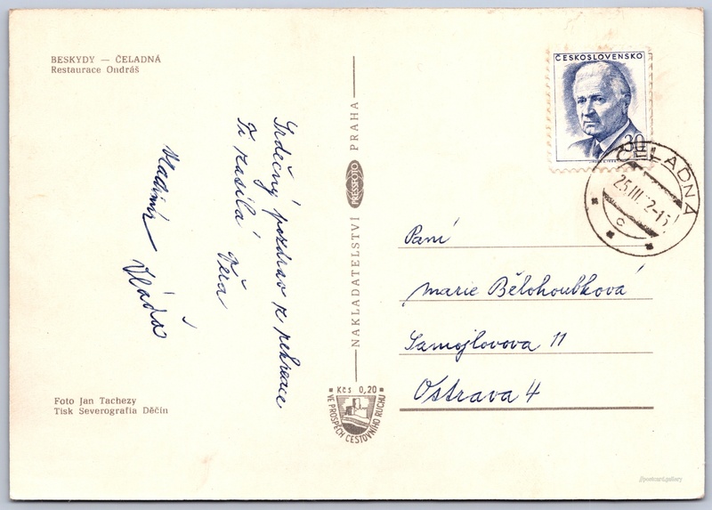 Beskydy, Čeladná, restaurace Ondráš Pokud chcete vidět pohlednice ve vyšším rozlišení nebo zobrazovat jejich zadní stranu, tak se prosím nejdříve přihlašte Přihlásit Zaregistrovat BESKYDY - ČELADNÁRestaurace Ondráš Jazyk tištěného textu na pohlednici: čeština Kunčice pod Ondřejníkem 310, Kunčice pod Ondřejníkem, 739 13, Frýdek-Místek ukázat na mapě V blízkém okolí místa zobrazeného na pohlednici lze najít 10 jiných pohlednic. Zobrazit blízké pohlednice Vydavatel: PressFoto Praha (Československo) Odhadované datum vydání pohlednice: 1969 - 1972 Pomozte nám zpřesnit rok vzniku pohlednice Velikost (š x v) a tvar pohlednice: 148 x 104 mm (5.83" x 4.09"), obdélník Osoby spjaté s touto pohlednicí: Jan Tachezy(Autor fotografie) Prošlá poštou:Datum na razítku: 25.3.1972 Ceny: Příplatek na tur. ruch: 0,20 Kčs (CSK))Vyplacené známky: 0,30 Kčs (CSK) DiskuseVložit příspěvek Přidat novou složku ... Spravovat složky ...