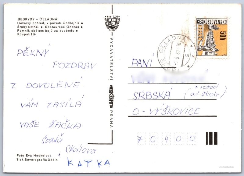 Beskydy, Čeladná Pokud chcete vidět pohlednice ve vyšším rozlišení nebo zobrazovat jejich zadní stranu, tak se prosím nejdříve přihlašte Přihlásit Zaregistrovat Beskydy - Čeladná BESKYDY - ČELADNÁ- Celkový pohled, v pozadí Ondřejník- Sruby NHKG- Restaurace Ondráš- Pomník obětem bojů za svobodu- Koupaliště Jazyk tištěného textu na pohlednici: čeština Čeladná, Obec, Česko ukázat na mapě Vydavatel: PressFoto Praha (Československo) Odhadované datum vydání pohlednice: 1979 - 1982 Pomozte nám zpřesnit rok vzniku pohlednice Velikost (š x v) a tvar pohlednice: 148 x 105 mm (5.83" x 4.13"), obdélník Osoby spjaté s touto pohlednicí: Eva Heckelová(Autor fotografie) Prošlá poštou:Datum na razítku: 2.8.1982 Ceny: Příplatek na tur. ruch: 0,20 Kčs (CSK))Vyplacené známky: 0,50 Kčs (CSK) DiskuseVložit příspěvek Přidat novou složku ... Spravovat složky ...