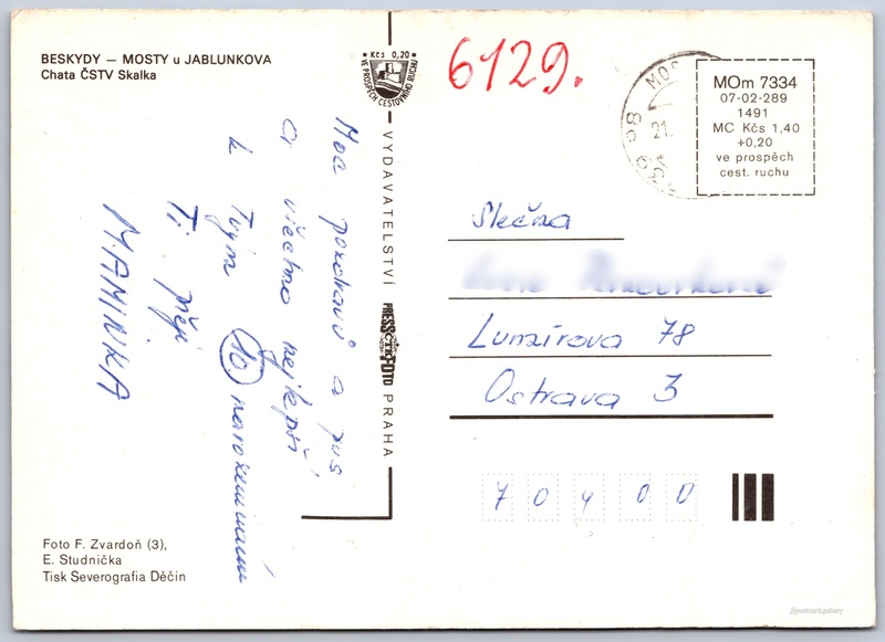 Beskydy, chata Skalka Pokud chcete vidět pohlednice ve vyšším rozlišení nebo zobrazovat jejich zadní stranu, tak se prosím nejdříve přihlašte Přihlásit Zaregistrovat BeskydyChata Skalka BESKYDY - MOSTY U JABLUNKOVAChata ČSTV Skalka Jazyk tištěného textu na pohlednici: čeština Horská chata Skalka, Mosty u Jablunkova 368, Mosty u Jablunkova, Česko ukázat na mapě Vydavatel: PressFoto Praha (Československo) Rok vydání pohlednice: 1982 Velikost (š x v) a tvar pohlednice: 147 x 106 mm (5.79" x 4.17"), obdélník Osoby spjaté s touto pohlednicí: E. Studnička(Autor fotografie) F. Zvardoň(Autor fotografie) Prošlá poštou Ceny: Cena pohlednice: 1,40 Kčs (CSK) (+0,20 Kčs přípl. na tur. ruch) Kódy na pohlednici: MOm 7334 07-02-289 1491 DiskuseVložit příspěvek Přidat novou složku ... Spravovat složky ...