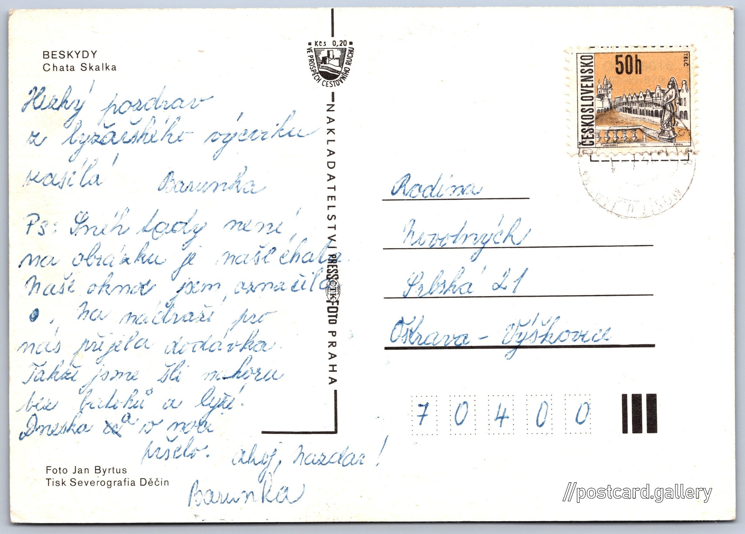 Beskydy, chata Skalka Pokud chcete vidět pohlednice ve vyšším rozlišení nebo zobrazovat jejich zadní stranu, tak se prosím nejdříve přihlašte Přihlásit Zaregistrovat BESKYDYChata Skalka Jazyk tištěného textu na pohlednici: čeština Horská chata Skalka, Mosty u Jablunkova 368, Mosty u Jablunkova, Česko ukázat na mapě V blízkém okolí místa zobrazeného na pohlednici lze najít 8 jiných pohlednic. Zobrazit blízké pohlednice Vydavatel: PressFoto Praha (Československo) Datum vydání není známo Pomozte nám odhadnout datum vzniku pohlednice Velikost (š x v) a tvar pohlednice: 148 x 104 mm (5.83" x 4.09"), obdélník Osoby spjaté s touto pohlednicí: Jan Byrtus(Autor fotografie) Prošlá poštou Ceny: Příplatek na tur. ruch: 0,20 Kčs (CSK))Vyplacené známky: 0,50 Kčs (CSK) DiskuseVložit příspěvek Přidat novou složku ... Spravovat složky ...