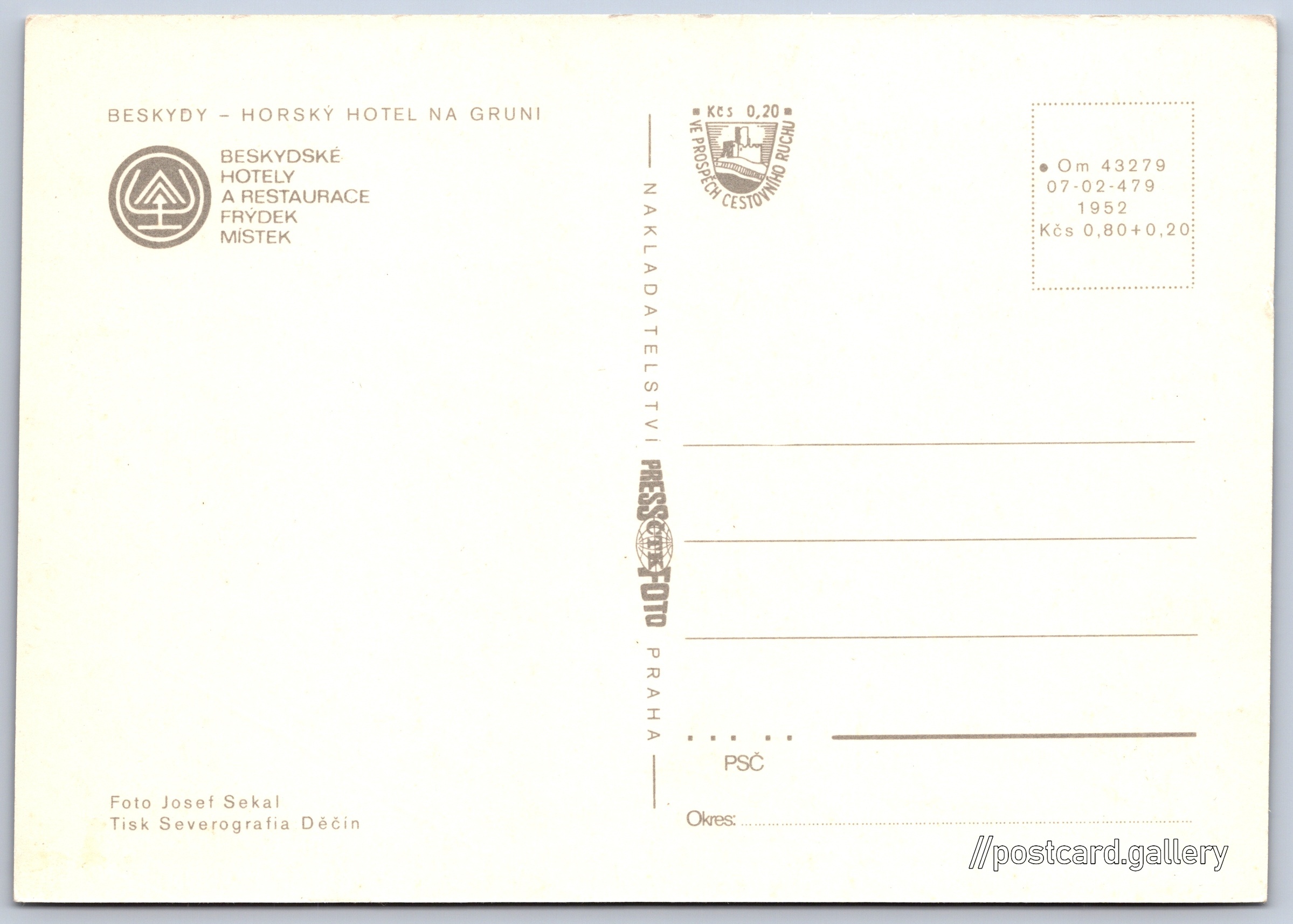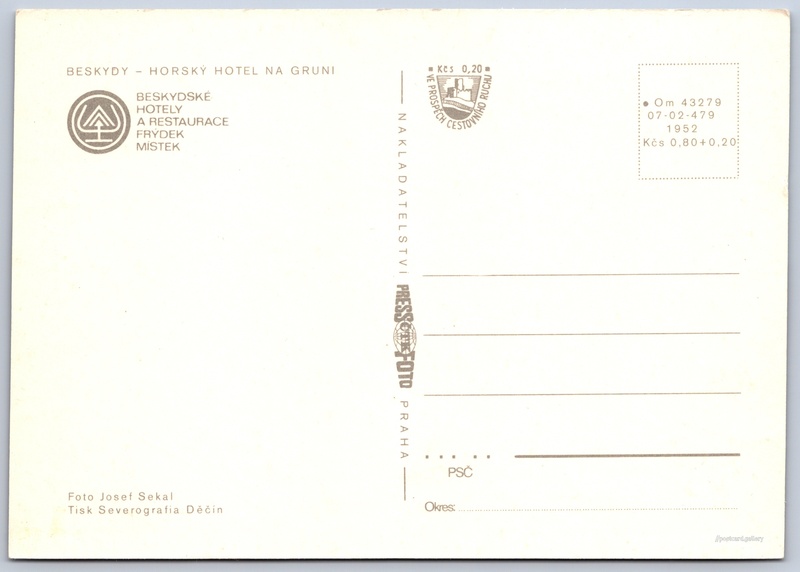 Beskydy, hotel na Gruni Pokud chcete vidět pohlednice ve vyšším rozlišení nebo zobrazovat jejich zadní stranu, tak se prosím nejdříve přihlašte Přihlásit Zaregistrovat Pozdrav z Gruně BESKYDY - HORSKÝ HOTEL NA GRUNIBESKYDSKÉ HOTELY A RESTAURACE FRÝDEK MÍSTEK Jazyk tištěného textu na pohlednici: čeština Horský hotel Charbulák, Staré Hamry 55, Staré Hamry, Česko ukázat na mapě V blízkém okolí místa zobrazeného na pohlednici lze najít 2 jiné pohlednice. Zobrazit blízké pohlednice Vydavatel: PressFoto Praha (Československo) Rok vydání pohlednice: 1974 Velikost (š x v) a tvar pohlednice: 147 x 104 mm (5.79" x 4.09"), obdélník Osoby spjaté s touto pohlednicí: Josef Sekal(Autor fotografie) Čistá pohlednice (neprošlá poštou) Ceny: Cena pohlednice: 0,80 Kčs (CSK) (+0,20 Kčs přípl. na tur. ruch) Kódy na pohlednici: •Om 43279 07-02-479 1952 DiskuseVložit příspěvek Přidat novou složku ... Spravovat složky ...