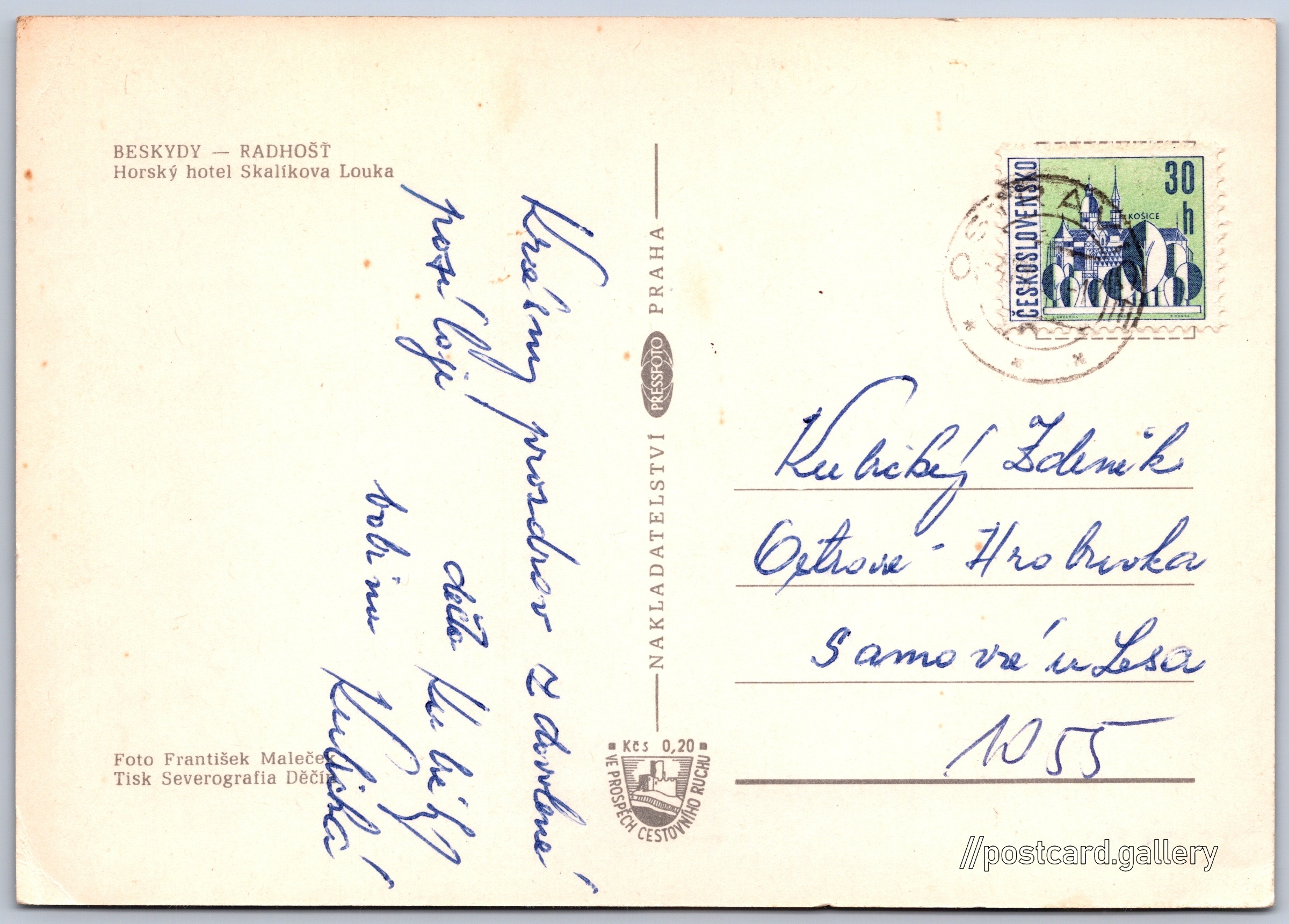 Beskydy, hotel Skalíkova louka Pokud chcete vidět pohlednice ve vyšším rozlišení nebo zobrazovat jejich zadní stranu, tak se prosím nejdříve přihlašte Přihlásit Zaregistrovat BESKYDY - RADHOŠŤHorský hotel Skalíkova Louka Jazyk tištěného textu na pohlednici: čeština Prostřední Bečva 266, Prostřední Bečva, 756 56, Vsetín ukázat na mapě V blízkém okolí místa zobrazeného na pohlednici lze najít 33 jiných pohlednic. Zobrazit blízké pohlednice Vydavatel: PressFoto Praha (Československo) Datum vydání není známo Pomozte nám odhadnout datum vzniku pohlednice Velikost (š x v) a tvar pohlednice: 149 x 105 mm (5.87" x 4.13"), obdélník Osoby spjaté s touto pohlednicí: František Maleček(Autor fotografie) Prošlá poštou Ceny: Příplatek na tur. ruch: 0,20 Kčs (CSK))Vyplacené známky: 0,30 Kčs (CSK) DiskuseVložit příspěvek Přidat novou složku ... Spravovat složky ...