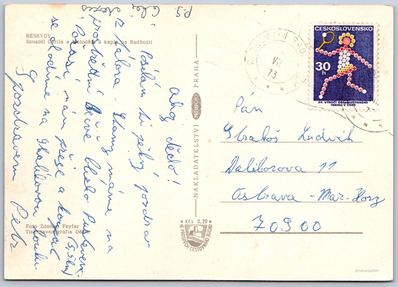 Beskydy, kaple na Radhošti 10/34 Pokud chcete vidět pohlednice ve vyšším rozlišení nebo zobrazovat jejich zadní stranu, tak se prosím nejdříve přihlašte Přihlásit Zaregistrovat BeskydySousoší Cyrila a Metoděje a kaple na Radhošti Jazyk tištěného textu na pohlednici: čeština Dolní Bečva 28, 756 55 Dolní Bečva, Czechia ukázat na mapě V blízkém okolí místa zobrazeného na pohlednici lze najít 31 jiných pohlednic. Zobrazit blízké pohlednice Vydavatel: PressFoto Praha (Československo) Odhadované datum vydání pohlednice: 1970 - 1973 Pomozte nám zpřesnit rok vzniku pohlednice Velikost (š x v) a tvar pohlednice: 147 x 105 mm (5.79" x 4.13"), obdélník Osoby spjaté s touto pohlednicí: Zdenko Feyfar(Autor fotografie) Prošlá poštou:Datum na razítku: 11.7.1973 Ceny: Příplatek na tur. ruch: 0,20 Kčs (CSK))Vyplacené známky: 0,30 Kčs (CSK) DiskuseVložit příspěvek Přidat novou složku ... Spravovat složky ...