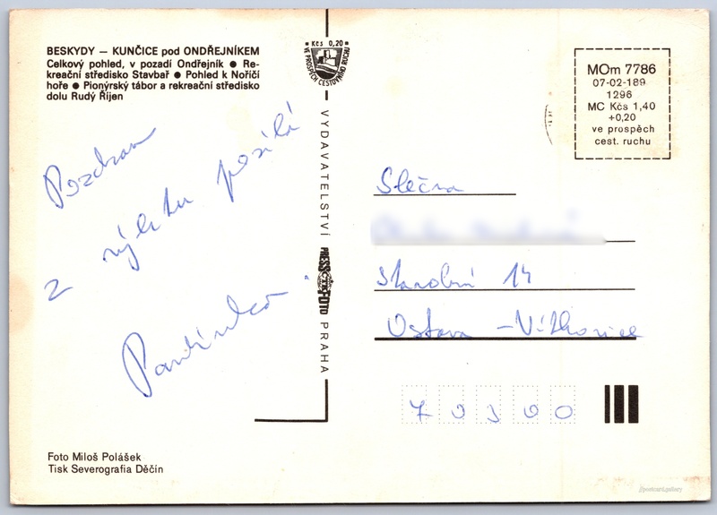 Beskydy, Kunčice pod Ondřejníkem Pokud chcete vidět pohlednice ve vyšším rozlišení nebo zobrazovat jejich zadní stranu, tak se prosím nejdříve přihlašte Přihlásit Zaregistrovat Beskydy - Kunčice pod Ondřejníkem BESKYDY - KUNČICE pod ONDŘEJNÍKEM- Celkový pohled, v pozadí Ondřejník- Rekreační středisko Stavbař- Pohled k Noříčí hoře- Pionýrský tábor a rekreační středisko dolu Rudý Říjen Jazyk tištěného textu na pohlednici: čeština Ondřejník (890 m), Hora, výškový bod, Metylovice, Česko ukázat na mapě Vydavatel: PressFoto Praha (Československo) Rok vydání pohlednice: 1981 Velikost (š x v) a tvar pohlednice: 148 x 104 mm (5.83" x 4.09"), obdélník Osoby spjaté s touto pohlednicí: Miloš Polášek(Autor fotografie) Prošlá poštou Ceny: Cena pohlednice: 1,40 Kčs (CSK) (+0,20 Kčs přípl. na tur. ruch) Kódy na pohlednici: MOm 7786 07-02-189 1296 DiskuseVložit příspěvek Přidat novou složku ... Spravovat složky ...