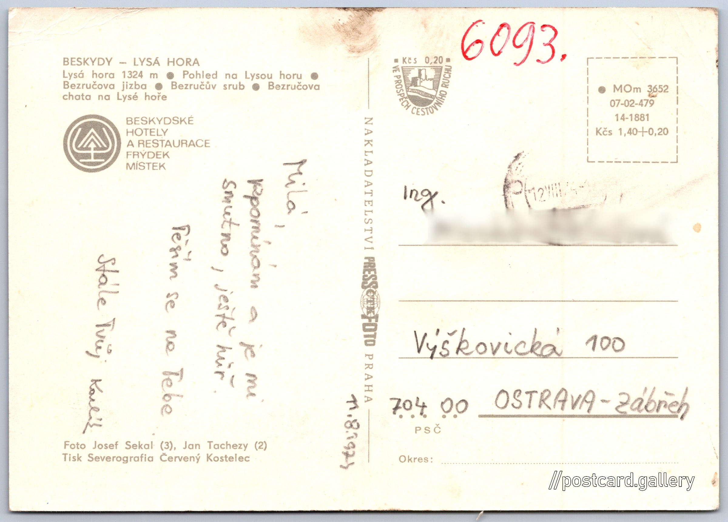 Beskydy, Lysá hora Pokud chcete vidět pohlednice ve vyšším rozlišení nebo zobrazovat jejich zadní stranu, tak se prosím nejdříve přihlašte Přihlásit Zaregistrovat Lysá hora BESKYDY - LYSÁ HORA- Lysá hora 1324 m- Pohled na Lysou horu- Bezručova jizba- Bezručův srub- Bezručova chata na Lysé hořeBESKYDSKÉ HOTELY A RESTAURACE FRÝDEK MÍSTEK Jazyk tištěného textu na pohlednici: čeština Lysá hora (1324 m), Hora, výškový bod, Krásná, Moravskoslezský kraj, Česko ukázat na mapě Vydavatel: PressFoto Praha (Československo) Rok vydání pohlednice: 1974 Velikost (š x v) a tvar pohlednice: 148 x 105 mm (5.83" x 4.13"), obdélník Osoby spjaté s touto pohlednicí: Petr Bezruč(Obsah pohlednice) Josef Sekal(Autor fotografie) Jan Tachezy(Autor fotografie) Prošlá poštou:Datum na razítku: 12.8.1974Datum napsání pohledu: 11.8.1974 Ceny: Cena pohlednice: 1,40 Kčs (CSK) (+0,20 Kčs přípl. na tur. ruch) Kódy na pohlednici: •MOm 3652 07-02-479 14-1881 DiskuseVložit příspěvek Přidat novou složku ... Spravovat složky ...