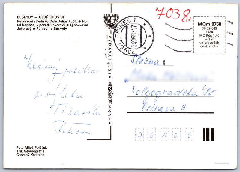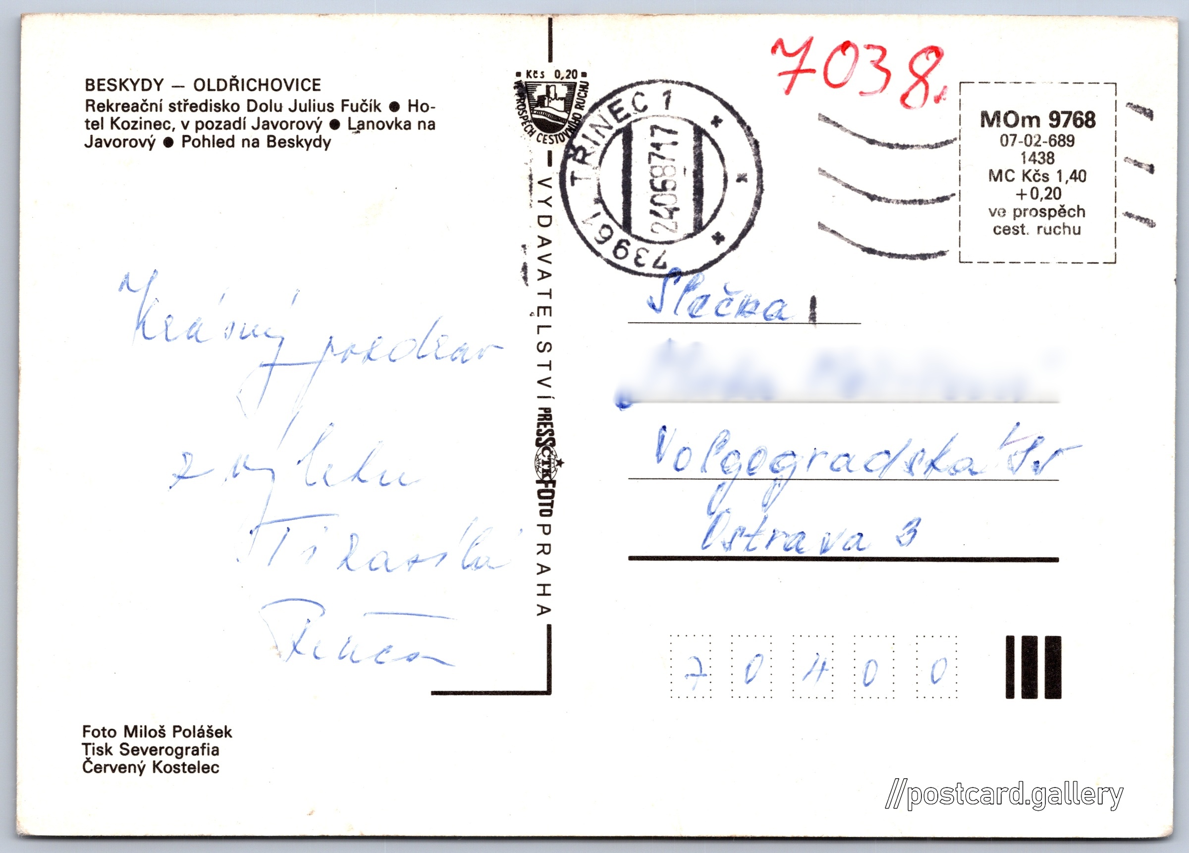 Beskydy, Oldřichovice 7/11 Pokud chcete vidět pohlednice ve vyšším rozlišení nebo zobrazovat jejich zadní stranu, tak se prosím nejdříve přihlašte Přihlásit Zaregistrovat Beskydy - Oldřichovice BESKYDY - OLDŘICHOVICE- Rekreační středisko Dolu Julius Fučík- Hotel Kozinec, v pozadí Javorový- Lanovka na Javorový- Pohled na Beskydy Jazyk tištěného textu na pohlednici: čeština Oldřichovice, Třinec, Frýdek-Místek ukázat na mapě Vydavatel: PressFoto Praha (Československo) Rok vydání pohlednice: 1986 Velikost (š x v) a tvar pohlednice: 148 x 105 mm (5.83" x 4.13"), obdélník Osoby spjaté s touto pohlednicí: Miloš Polášek(Autor fotografie) Julius Fučík(Obsah pohlednice) Prošlá poštou:Datum na razítku: 24.6.1987 Ceny: Cena pohlednice: 1,40 Kčs (CSK) (+0,20 Kčs přípl. na tur. ruch) Kódy na pohlednici: MOm 9768 07-02-689 1438 DiskuseVložit příspěvek Přidat novou složku ... Spravovat složky ...