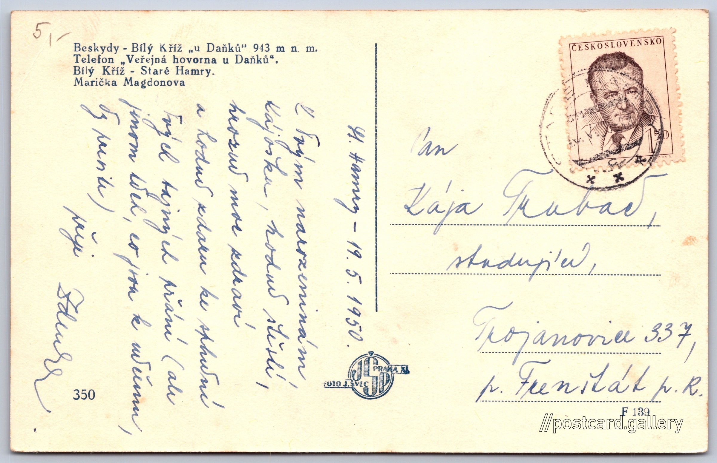 Beskydy, pomník Maryčky Magdonové 4/4 Pokud chcete vidět pohlednice ve vyšším rozlišení nebo zobrazovat jejich zadní stranu, tak se prosím nejdříve přihlašte Přihlásit Zaregistrovat Beskydy - Bílý Kříž "u Daňků" 943 m n. m.Telefon "Veřejná hovorna u Daňků".Bílý Kříž - Staré Hamry.Marička Magdonova Jazyk tištěného textu na pohlednici: čeština Staré Hamry 155, 739 15 Staré Hamry, Czechia ukázat na mapě V blízkém okolí místa zobrazeného na pohlednici lze najít 5 jiných pohlednic. Zobrazit blízké pohlednice Vydavatel: Foto J. Švec (Československo) Odhadované datum vydání pohlednice: 1947 - 1950 Pomozte nám zpřesnit rok vzniku pohlednice Velikost (š x v) a tvar pohlednice: 139 x 89 mm (5.47" x 3.50"), obdélník Osoby spjaté s touto pohlednicí: Petr Bezruč(Obsah pohlednice) Prošlá poštou:Datum napsání pohledu: 19.5.1950 Ceny: Vyplacené známky: 1,50 Kčs (CSK) Kódy na pohlednici: 350 DiskuseVložit příspěvek Přidat novou složku ... Spravovat složky ...