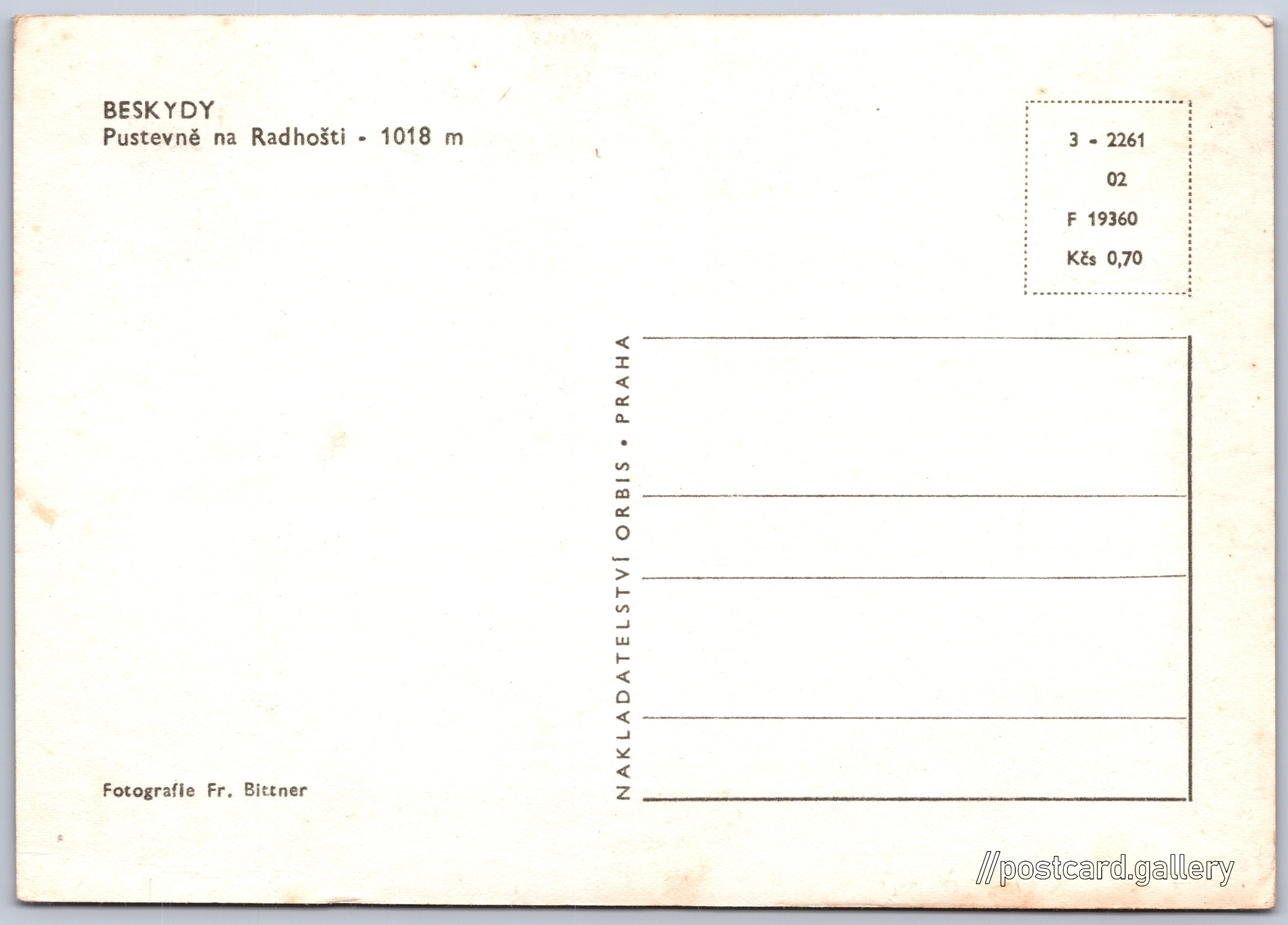 Beskydy, Pustevny Pokud chcete vidět pohlednice ve vyšším rozlišení nebo zobrazovat jejich zadní stranu, tak se prosím nejdříve přihlašte Přihlásit Zaregistrovat BESKYDYPustevně na Radhošti - 1018 m Jazyk tištěného textu na pohlednici: čeština Prostřední Bečva, Vsetín ukázat na mapě V blízkém okolí místa zobrazeného na pohlednici lze najít 32 jiných pohlednic. Zobrazit blízké pohlednice Vydavatel: Nakladatelství Orbis (Československo) Datum vydání není známo Pomozte nám odhadnout datum vzniku pohlednice Velikost (š x v) a tvar pohlednice: 146 x 103 mm (5.75" x 4.06"), obdélník Osoby spjaté s touto pohlednicí: Fr. Bittner(Autor fotografie) Čistá pohlednice (neprošlá poštou) Ceny: Cena pohlednice: 0,70 Kčs (CSK) Kódy na pohlednici: 3-2261 02 F 19360 DiskuseVložit příspěvek Přidat novou složku ... Spravovat složky ...
