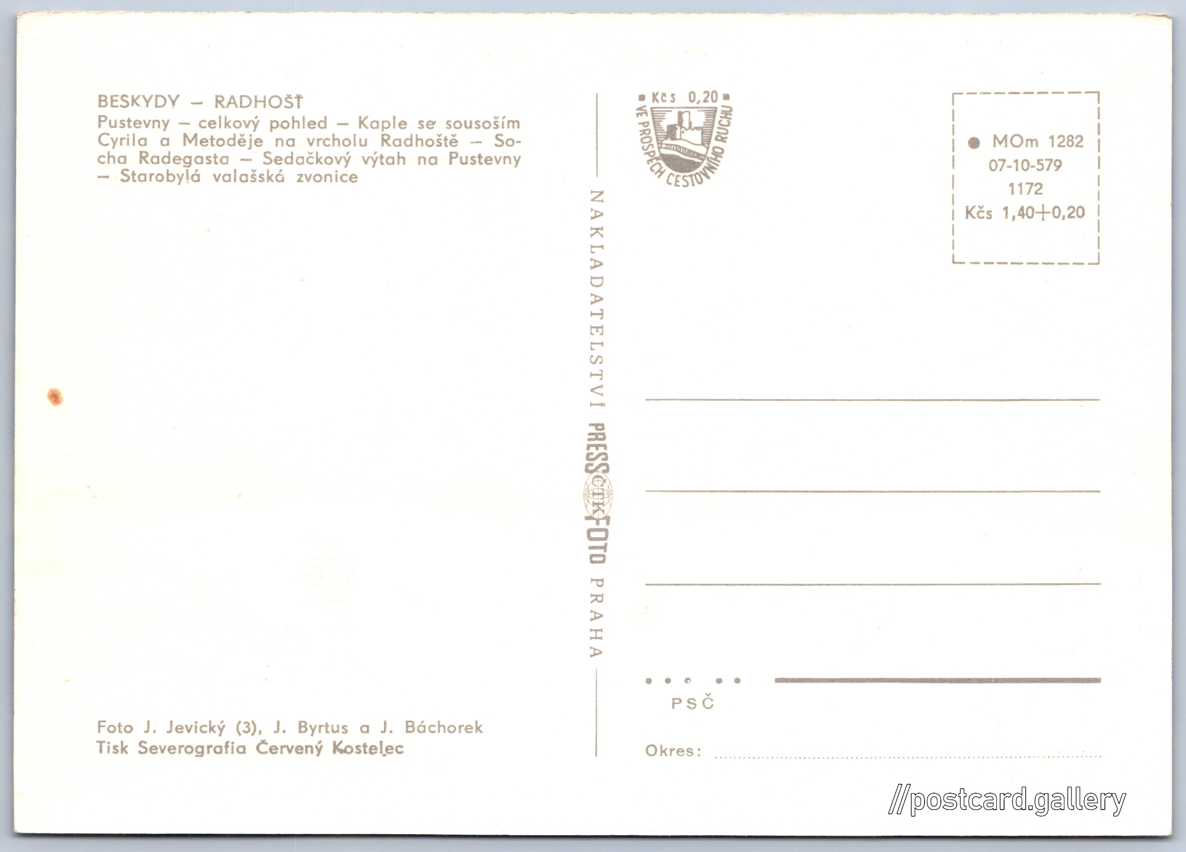 Beskydy, Radhošť Pokud chcete vidět pohlednice ve vyšším rozlišení nebo zobrazovat jejich zadní stranu, tak se prosím nejdříve přihlašte Přihlásit Zaregistrovat BeskydyRadhošť BESKYDY - RADHOŠŤ- Pustevny - celkový pohled- Kaple se sousoším Cyrila a Metoděje na vrcholu Radhoště- Socha Radegasta- Sedačkový výtah na Pustevny- Starobylá valašská zvonice Jazyk tištěného textu na pohlednici: čeština Pustevny, Místní název, osada, Prostřední Bečva, Česko ukázat na mapě V blízkém okolí místa zobrazeného na pohlednici lze najít 32 jiných pohlednic. Zobrazit blízké pohlednice Vydavatel: PressFoto Praha (Československo) Rok vydání pohlednice: 1975 Velikost (š x v) a tvar pohlednice: 147 x 105 mm (5.79" x 4.13"), obdélník Osoby spjaté s touto pohlednicí: Jan Jevický(Autor fotografie) Jan Byrtus(Autor fotografie) J. Báchorek(Autor fotografie) Čistá pohlednice (neprošlá poštou) Ceny: Cena pohlednice: 1,40 Kčs (CSK) (+0,20 Kčs přípl. na tur. ruch) Kódy na pohlednici: MOm 1282 07-10-579 1172 DiskuseVložit příspěvek Přidat novou složku ... Spravovat složky ...