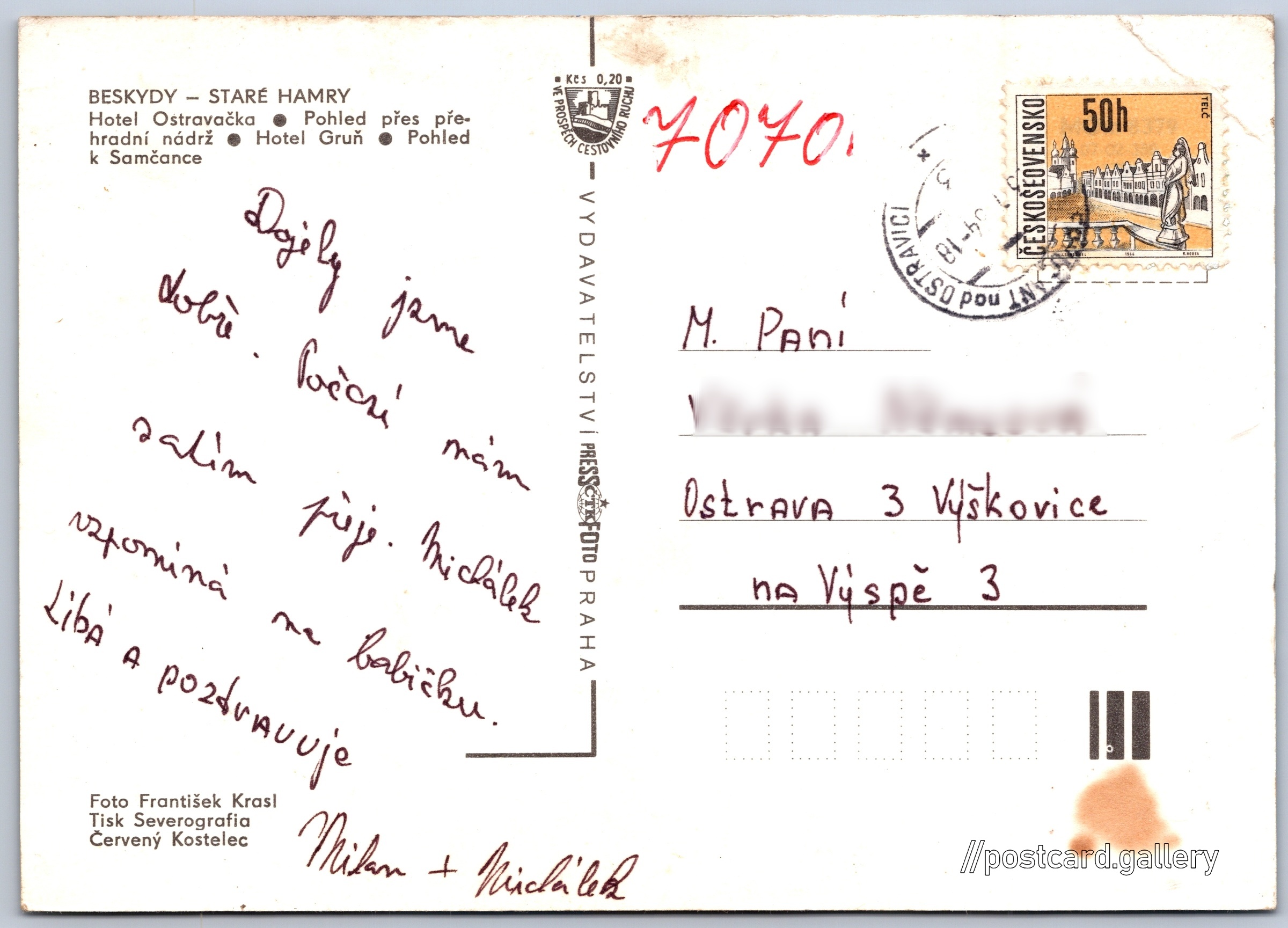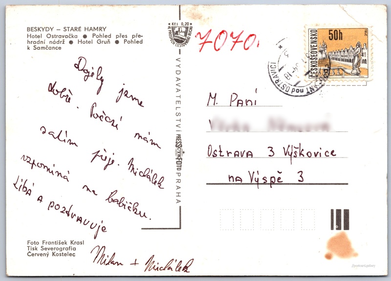 Beskydy, Staré Hamry Pokud chcete vidět pohlednice ve vyšším rozlišení nebo zobrazovat jejich zadní stranu, tak se prosím nejdříve přihlašte Přihlásit Zaregistrovat Staré Hamry BESKYDY - STARÉ HAMRY- Hotel Ostravačka- Pohled přes přehradní nádrž- Hotel Gruň- Pohled k Samčance Jazyk tištěného textu na pohlednici: čeština Staré Hamry 144, Staré Hamry, 739 15, Frýdek-Místek ukázat na mapě Vydavatel: PressFoto Praha (Československo) Datum vydání není známo Pomozte nám odhadnout datum vzniku pohlednice Velikost (š x v) a tvar pohlednice: 148 x 105 mm (5.83" x 4.13"), obdélník Osoby spjaté s touto pohlednicí: František Krasl(Autor fotografie) Prošlá poštou Ceny: Příplatek na tur. ruch: 0,20 Kčs (CSK))Vyplacené známky: 0,50 Kčs (CSK) DiskuseVložit příspěvek Přidat novou složku ... Spravovat složky ...