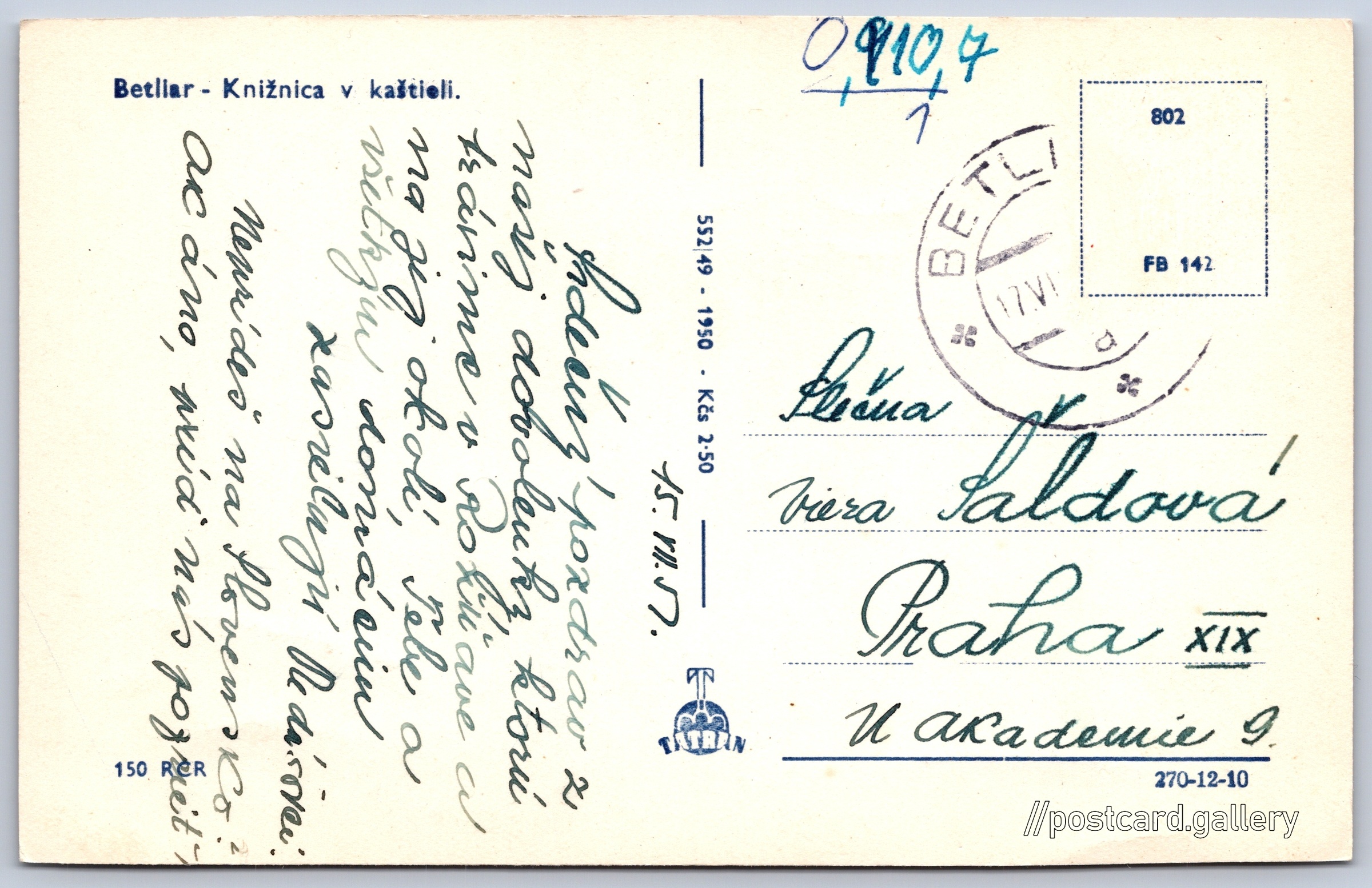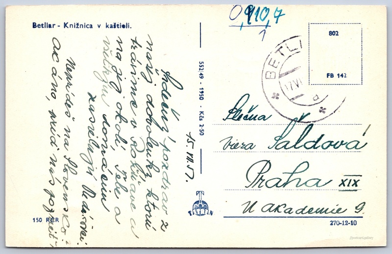 Betliar, knihovna v zámečku 2/3 Pokud chcete vidět pohlednice ve vyšším rozlišení nebo zobrazovat jejich zadní stranu, tak se prosím nejdříve přihlašte Přihlásit Zaregistrovat Betliar - Knižnica v kaštieli. Jazyk tištěného textu na pohlednici: slovenština Betliar, Zámek, Lesná 6/11, Betliar, Slovensko ukázat na mapě V blízkém okolí místa zobrazeného na pohlednici lze najít 3 jiné pohlednice. Zobrazit blízké pohlednice Vydavatel: Tatran (Československo) Datum vydání není známo Pomozte nám odhadnout datum vzniku pohlednice Velikost (š x v) a tvar pohlednice: 136 x 87 mm (5.35" x 3.43"), obdélník Prošlá poštou:Datum na razítku: 17.7.1957Datum napsání pohledu: 15.7.1957 Ceny: Cena pohlednice: 2,50 Kčs (CSK) Kódy na pohlednici: 150 RCR 552|49 1950 802 FB 142 DiskuseVložit příspěvek Přidat novou složku ... Spravovat složky ...