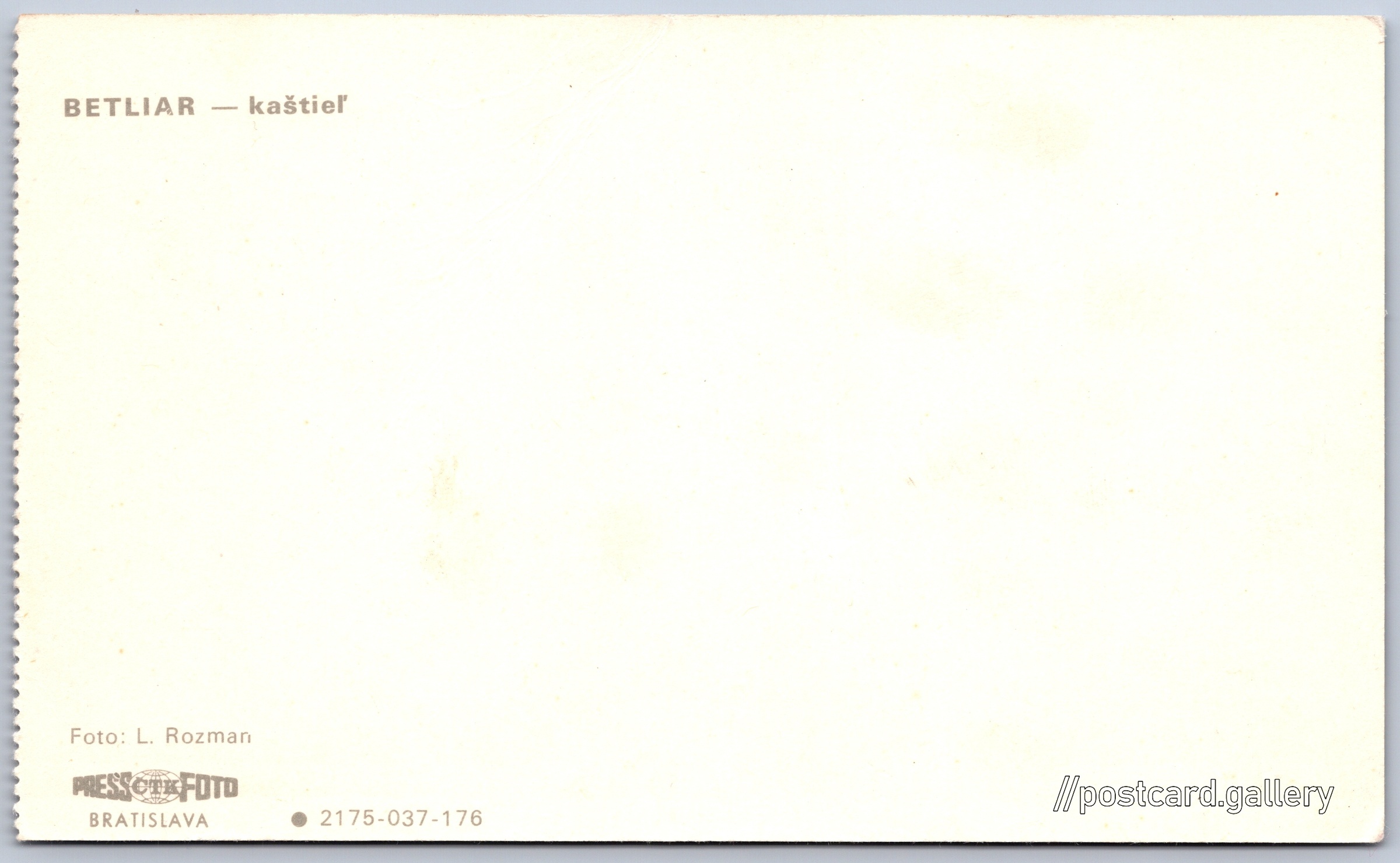 Betliar, zámek Pokud chcete vidět pohlednice ve vyšším rozlišení nebo zobrazovat jejich zadní stranu, tak se prosím nejdříve přihlašte Přihlásit Zaregistrovat BETLIAR - kaštieľ Jazyk tištěného textu na pohlednici: slovenština Kaštieľ Betliar, Muzeum, Šafárikova 10/8, Betliar, Slovensko ukázat na mapě V blízkém okolí místa zobrazeného na pohlednici lze najít 3 jiné pohlednice. Zobrazit blízké pohlednice Vydavatel: PressFoto Bratislava (Československo) Datum vydání není známo Pomozte nám odhadnout datum vzniku pohlednice Velikost (š x v) a tvar pohlednice: 148 x 89 mm (5.83" x 3.50"), obdélník Osoby spjaté s touto pohlednicí: Ladislav Rozman(Autor fotografie) Čistá pohlednice (neprošlá poštou) Kódy na pohlednici: 2175-037-176 DiskuseVložit příspěvek Přidat novou složku ... Spravovat složky ...
