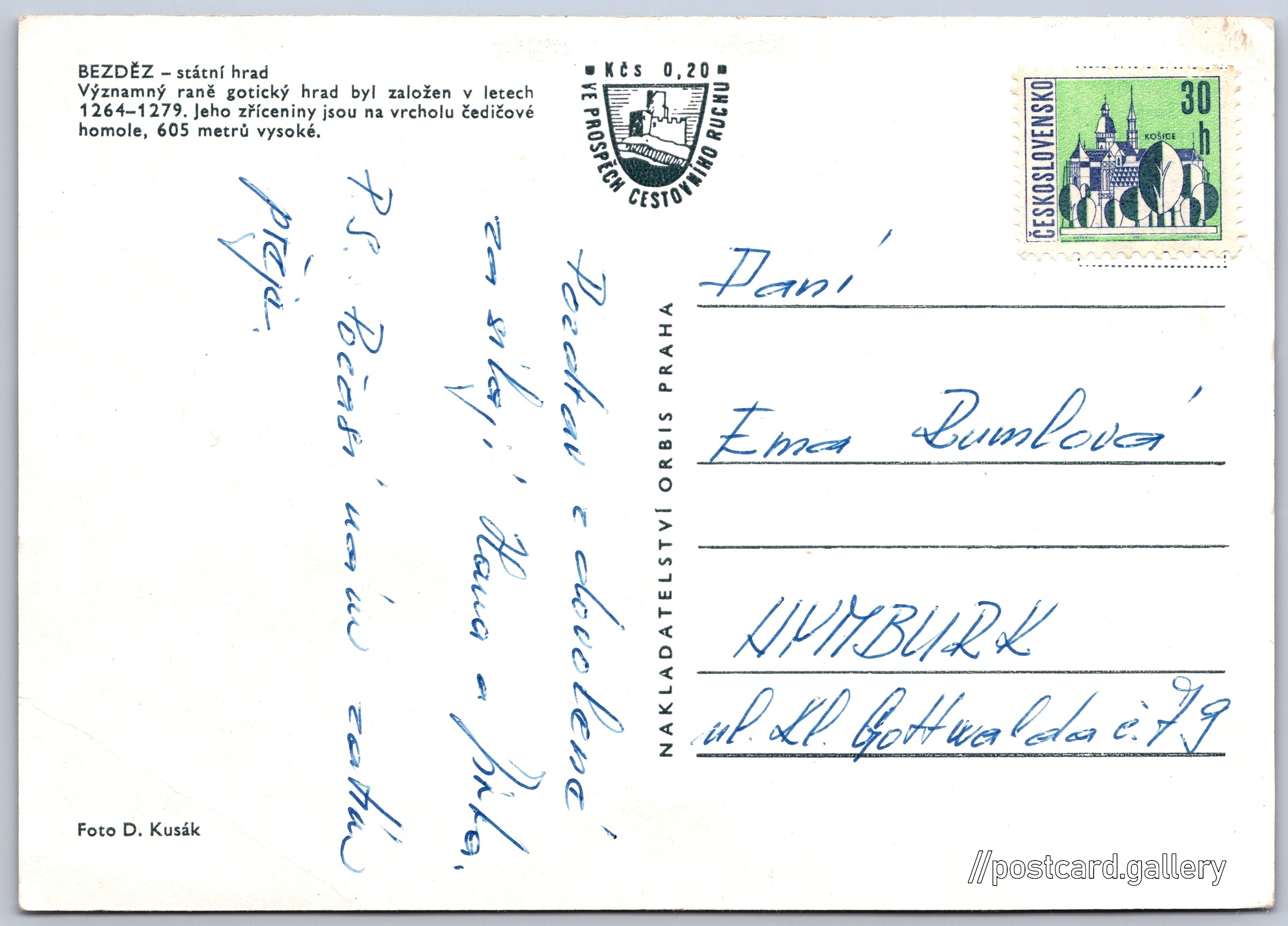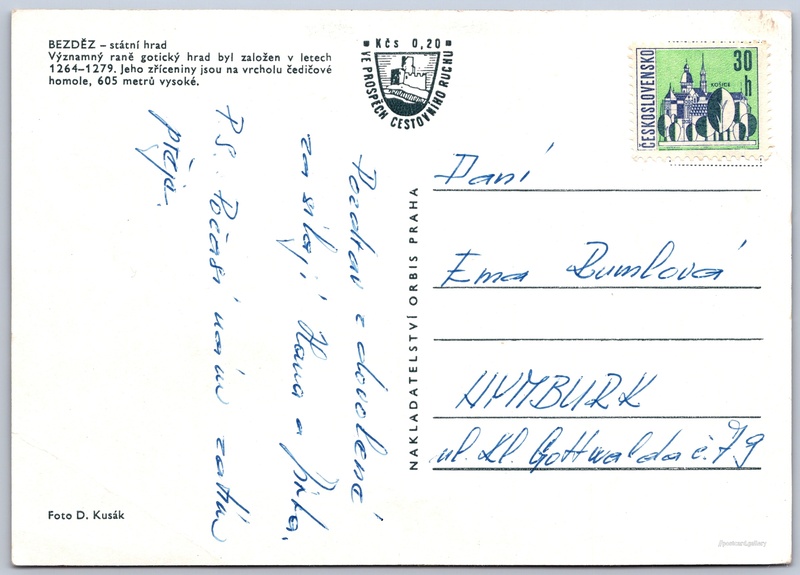 Bezděz, státní hrad Pokud chcete vidět pohlednice ve vyšším rozlišení nebo zobrazovat jejich zadní stranu, tak se prosím nejdříve přihlašte Přihlásit Zaregistrovat BEZDĚZ - státní hradVýznamný raně gotický hrad byl založen v letech 1264-1279. Jeho zříceniny jsou na vrcholu čedičové homole, 605 metrů vysoké. Jazyk tištěného textu na pohlednici: čeština Bezděz 144, 472 01 Bezděz, Czechia ukázat na mapě V blízkém okolí místa zobrazeného na pohlednici lze najít 6 jiných pohlednic. Zobrazit blízké pohlednice Vydavatel: Nakladatelství Orbis (Československo) Datum vydání není známo Pomozte nám odhadnout datum vzniku pohlednice Velikost (š x v) a tvar pohlednice: 148 x 106 mm (5.83" x 4.17"), obdélník Osoby spjaté s touto pohlednicí: Dalibor Kusák(Autor fotografie) Prošlá poštou Ceny: Příplatek na tur. ruch: 0,20 Kčs (CSK))Vyplacené známky: 0,30 Kčs (CSK) DiskuseVložit příspěvek Přidat novou složku ... Spravovat složky ...